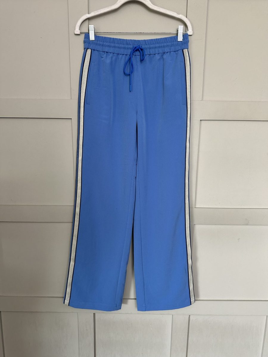 This beautiful pair of sport luxe, jogger style wide leg trousers are so comfortable and can be styled in lots of ways. They can be dressed up or down and can be worn all year round. They have an elasticated waistband with a drawstring, faux pockets to the sides and chevron stripe detailing down the sides in an oatmeal fabric with navy blue trim.