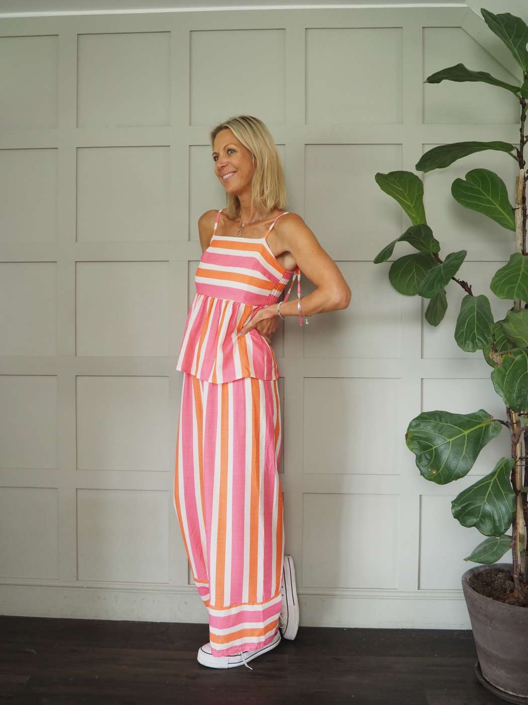 Beautiful two piece consisting of wide legged trousers and a little vest top. The vest top has ties on the straps, a square neck, an elasticated back and has horizontal stripes on the bust and vertical stripes from the bust down.
