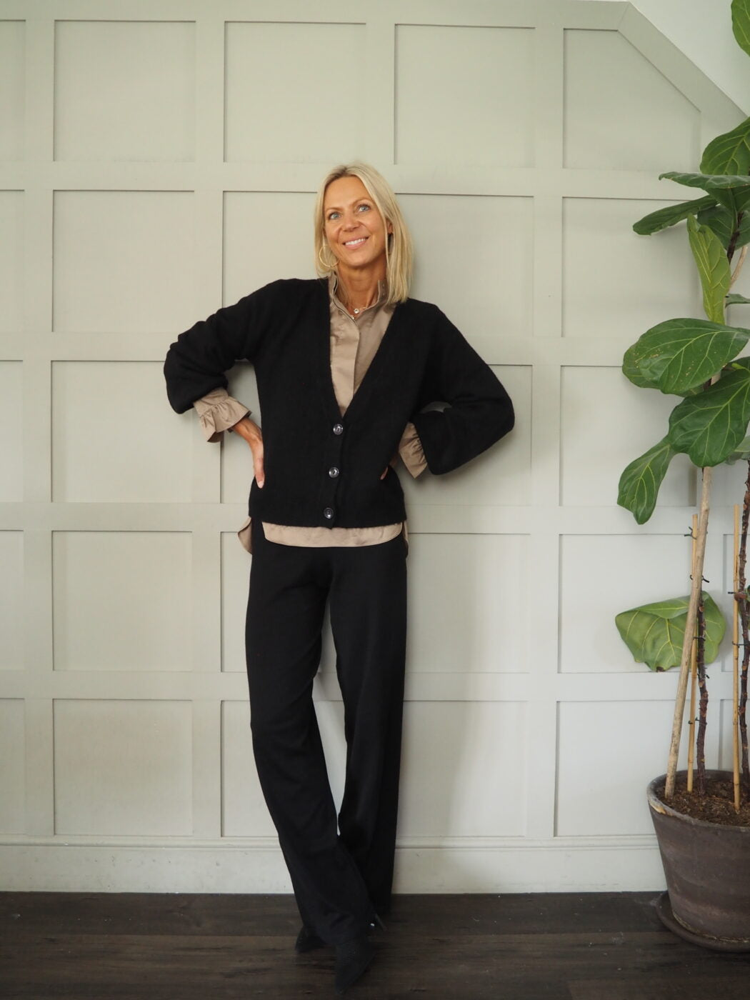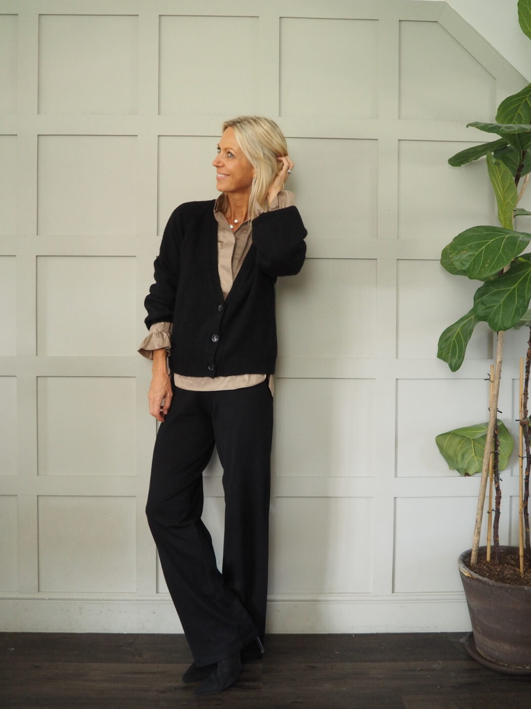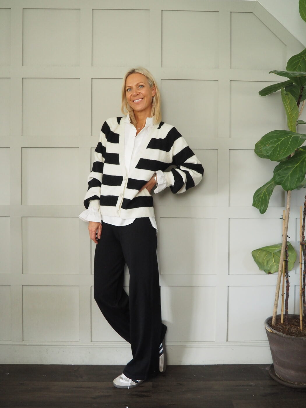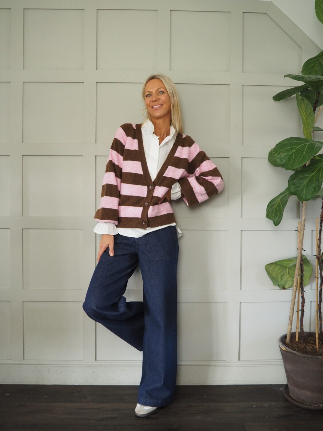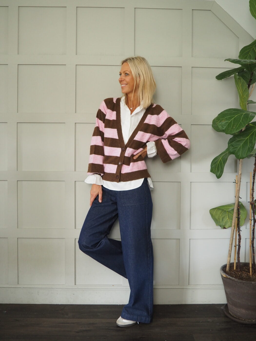 These beautiful cardigans are such a fab addition to your new season wardrobe and can be styled in so many ways. They have very pretty full sleeves with pleated cuffs which add such a lovely feminine detail. Available in 4 colourways, classic black, lime green, pink/brown stripe and black/ecru stripe. 3 button fastenings which can be worn buttoned up or unbuttoned. They look great layered with a blouse, cami or T shirt underneath and can be worn with skirts, jeans and trousers for different looks. Worn here with the DIZZY Camisole – 2 Colours the RICKI Blouse – 2 Colours the Gwynneth Wide Leg Jeans and the Mila Pants.