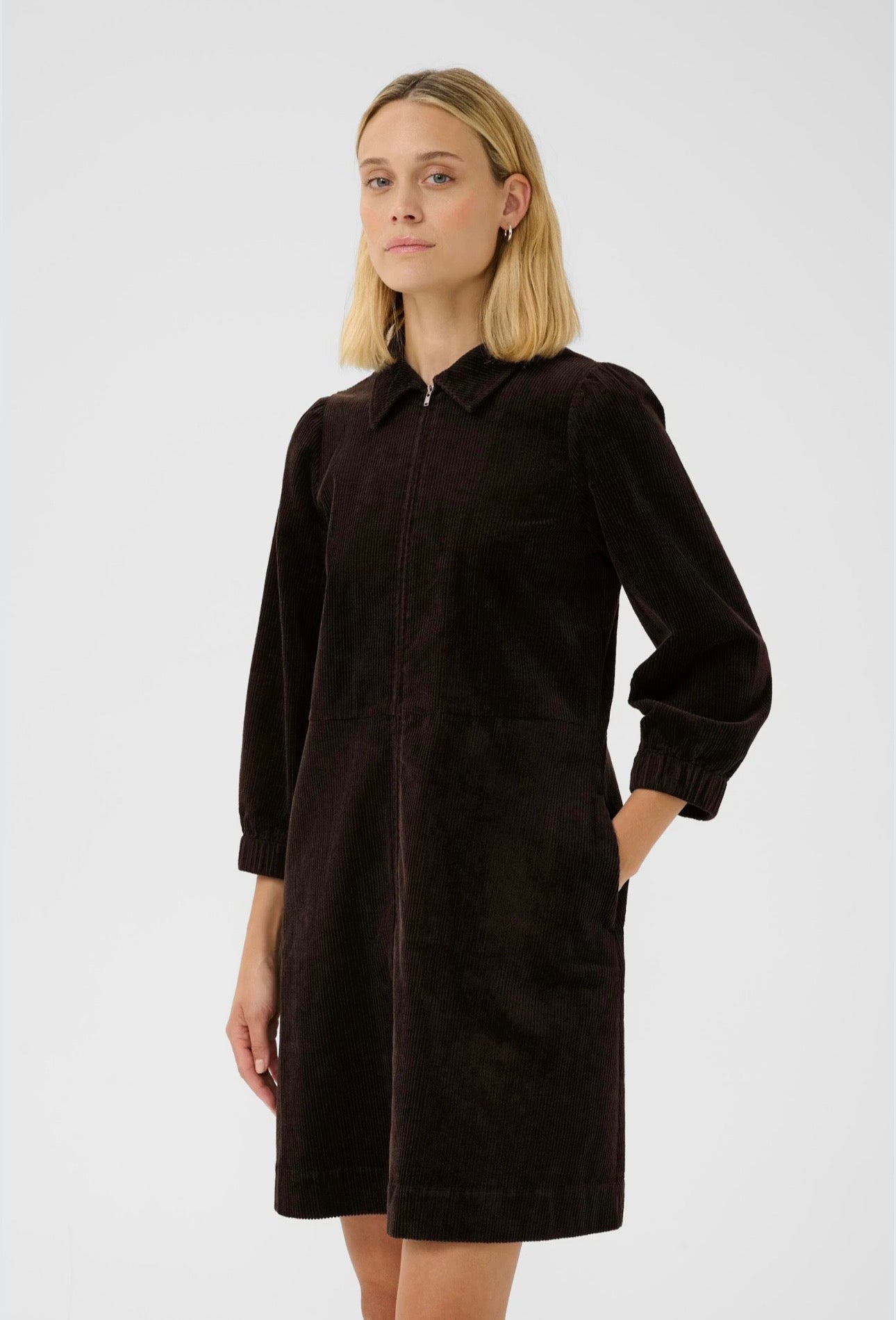 Eyvor Corduroy Dress with Long Sleeves, Front Zip Fastening by Part Two - Black, Chocolate