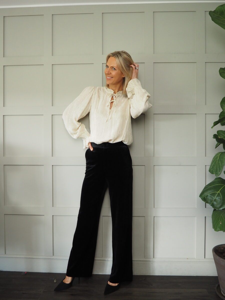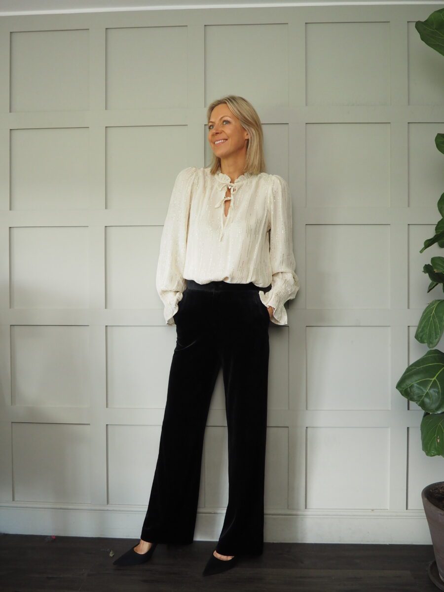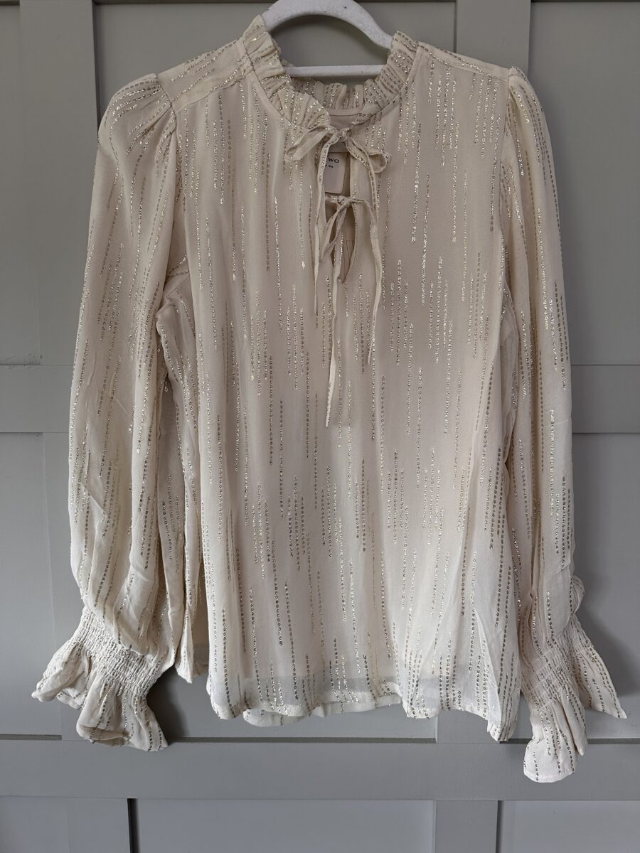 Pretty little blouse with gold and silver sparkly thread detail throughout. This blouse has a pretty, frilly high pie crust collar, two tie details at the neck, both of which can be tied up or left undone. Slightly puffed shoulders and elasticated cuffs with frill detail. The body is lined.