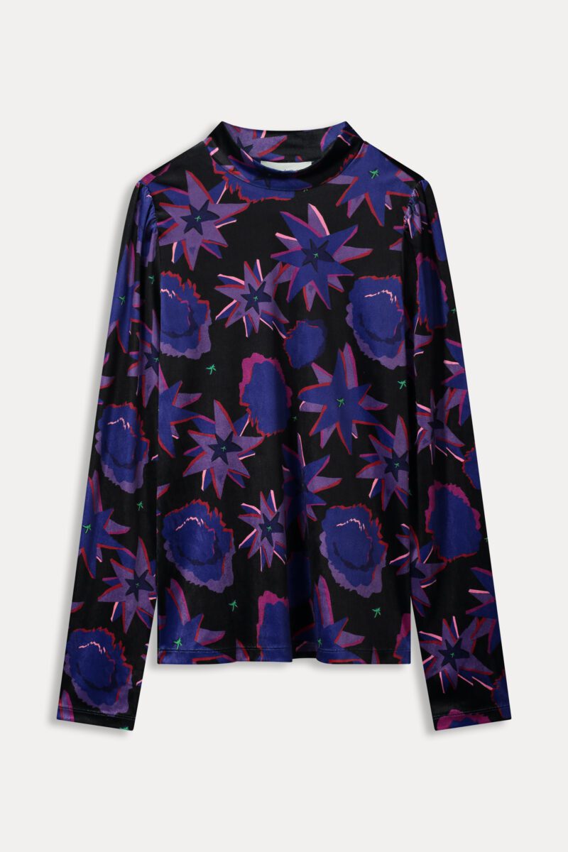 Violet, pink and blacks make up the colours of the pattern of this pretty evening top. It is velvety in look and feel and matches beautifully with the Violet Stardust Trousers. Long sleeved, turtle neck and a fitted style.