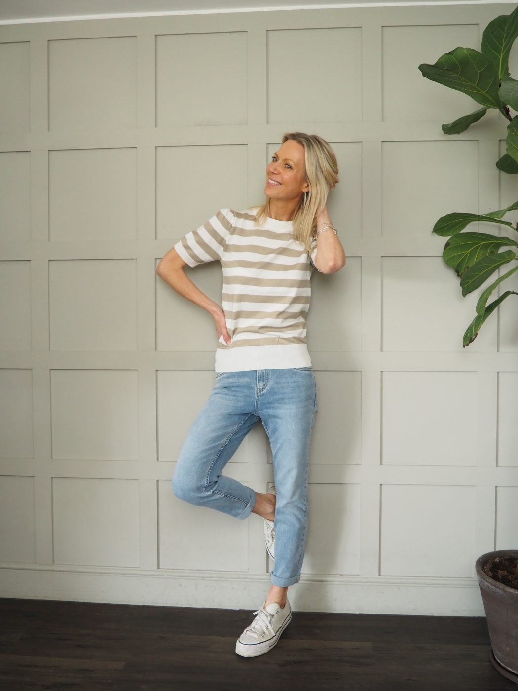 The Baby is the short sleeve version of our bestselling Oasis Round Neck Lightweight Jumper with Ribbing Detail by Saint Tropez – Baby Pink, Blue, Buttermilk and Ecru. A lightweight jumper featuring subtle puffed shoulders. The Baby has horizontal stripes and the neckline, cuffs and hem are ribbed. A perfect fine knit which can be worn with jeans, smarter trousers, skirts and shorts.