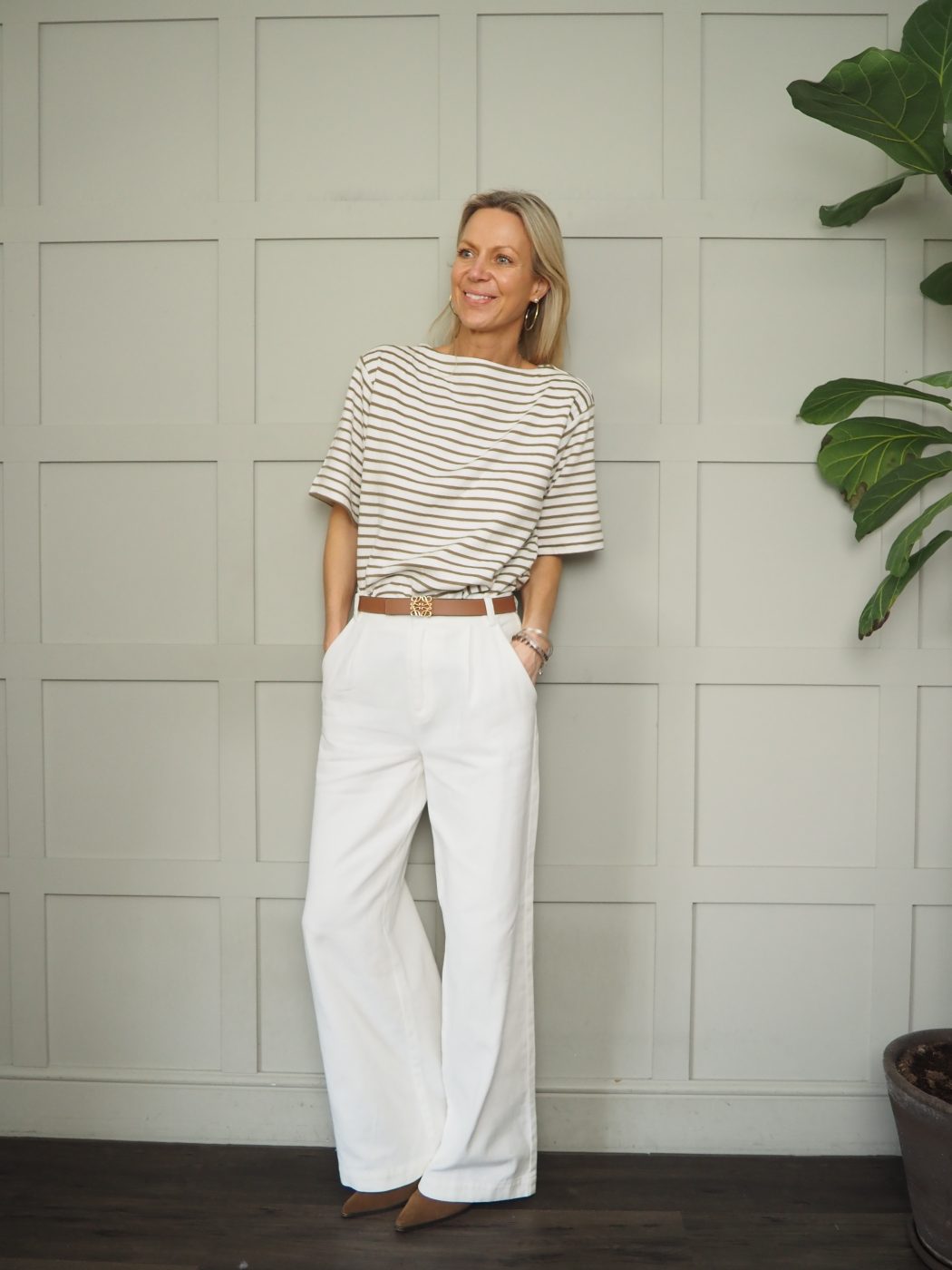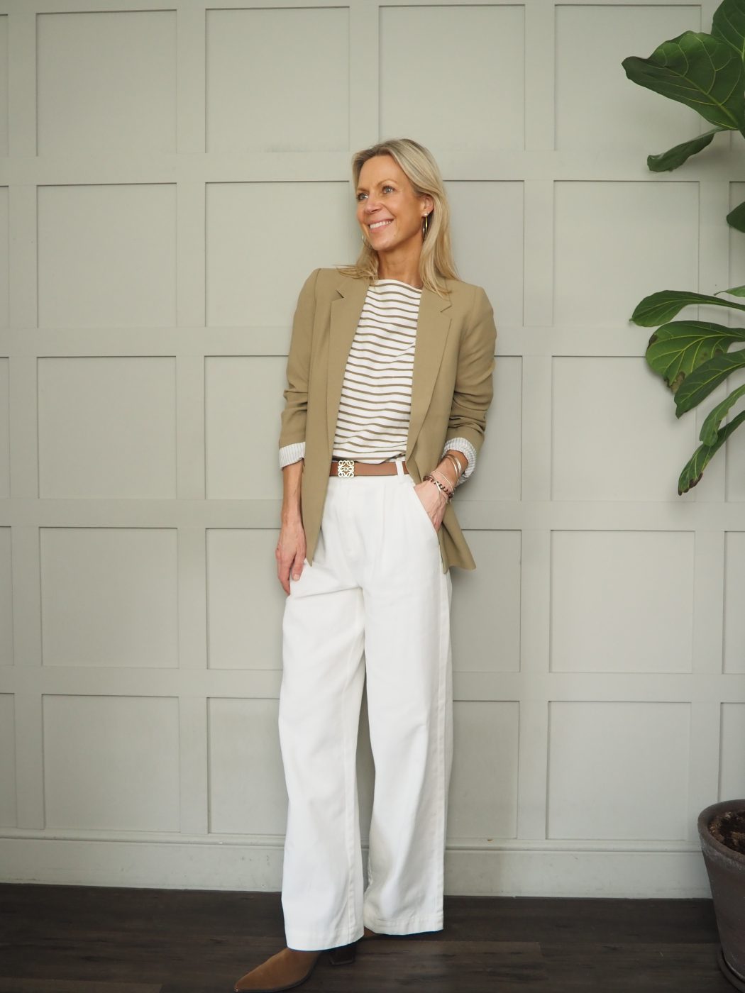 Worn with: Lingina Stripe Short Sleeve Sweatshirt with Boat Neck Stripes by Soaked – Ecru/Fawn Stripes and the Barcelona Blazer with Fold Up Sleeves by Soaked – Fawn