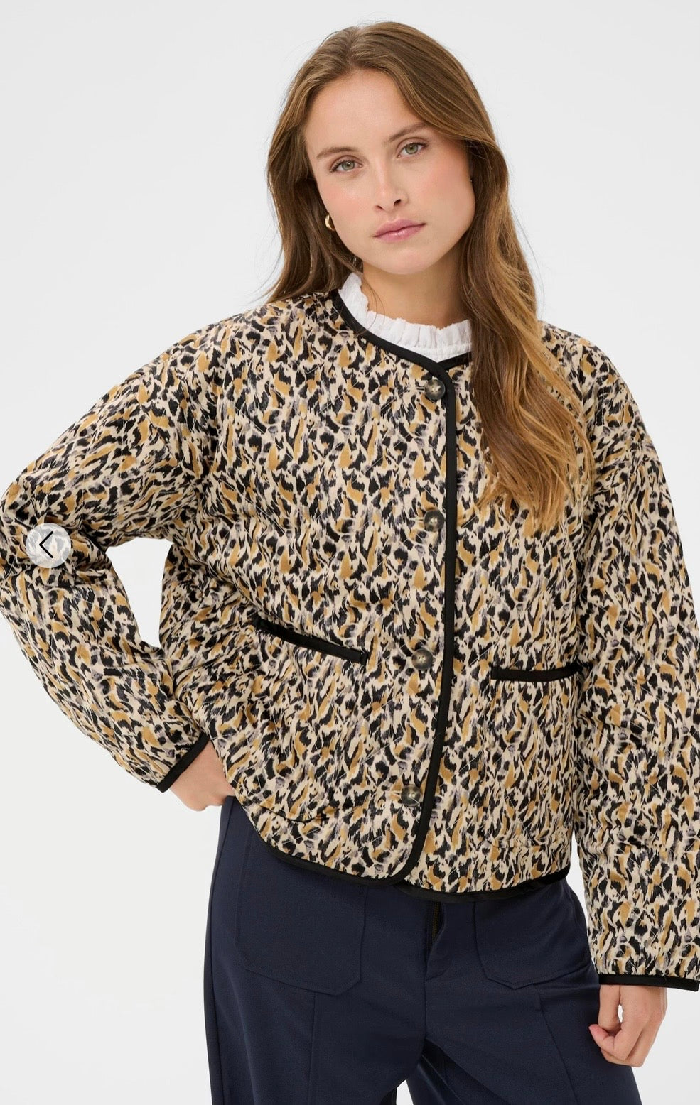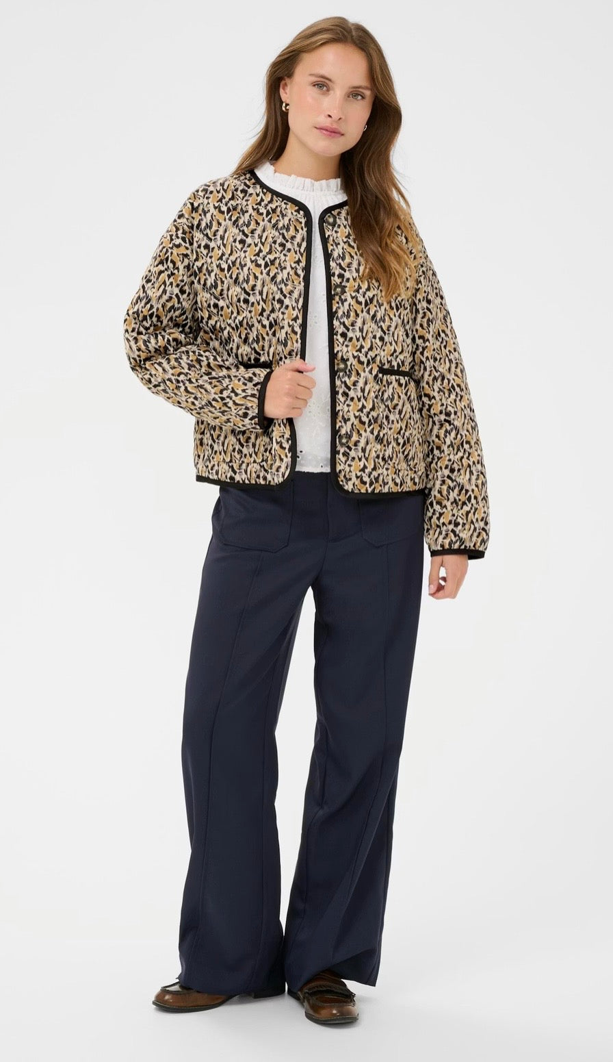 This relaxed fit jacket has a round neckline and features full length sleeves and front button closure. Contrasting trim and practical front pockets ensure versatile style and comfort. Ideal for casual or smart-casual looks. A perfect layering piece.