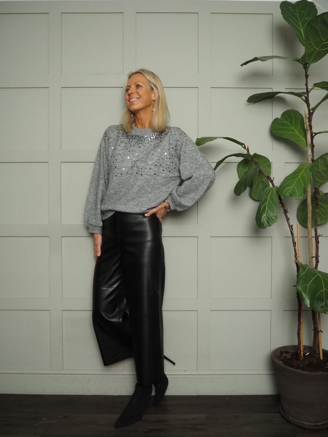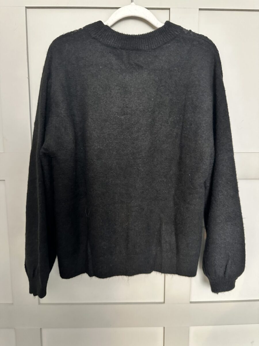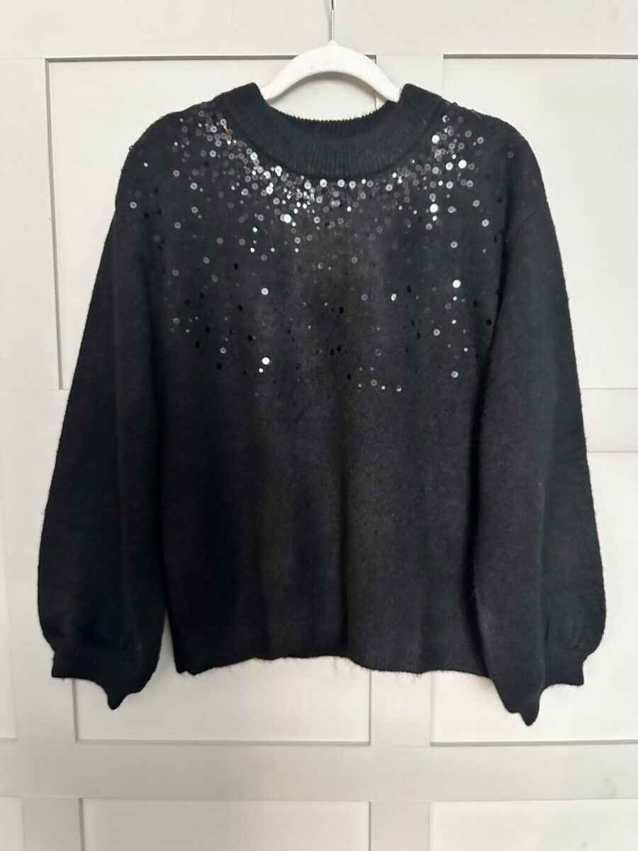 The perfect knit to take you into party season. The jumper has subtle sequin detail on the front and the back has no sequins on it. It has a round neck, full length, full sleeves with pleats on the cuffs which gives them a feminine shape. Super soft and comfortable which works well with jeans or dressed up with skirts and trousers.