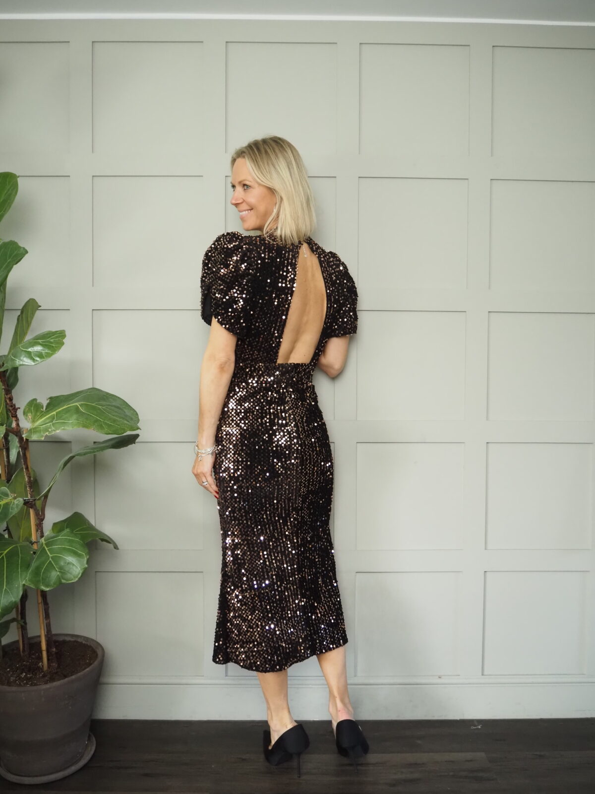 This fabulous fully sequinned midi dress has a high neck at the front with an open back with a zip fastening. Featuring puffed, capped sleeves and a pleated detail above the waistband.