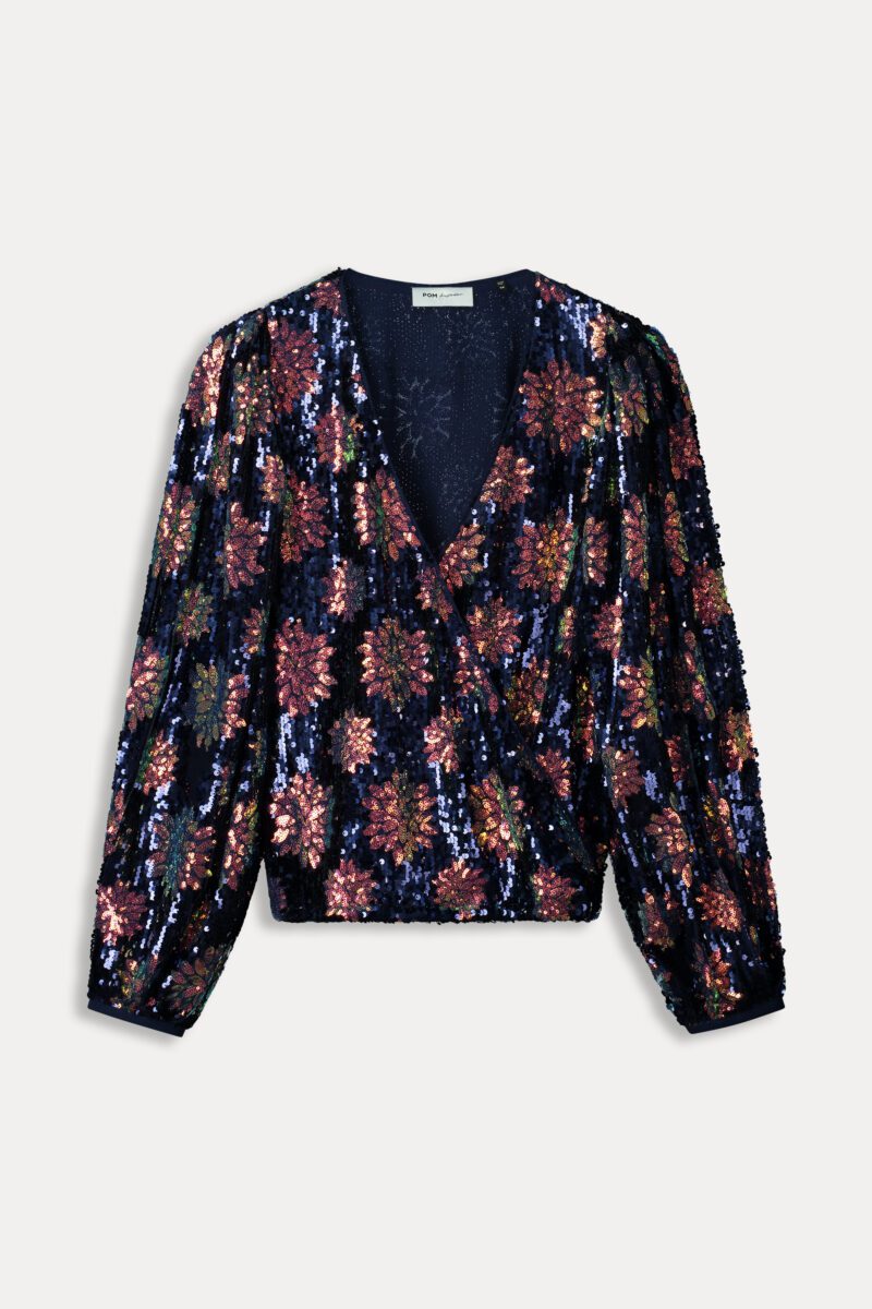 Mesmerising Glitter Sequin Blouse with Long Sleeves, V-Neck and Crossover Front by Pom Amsterdam