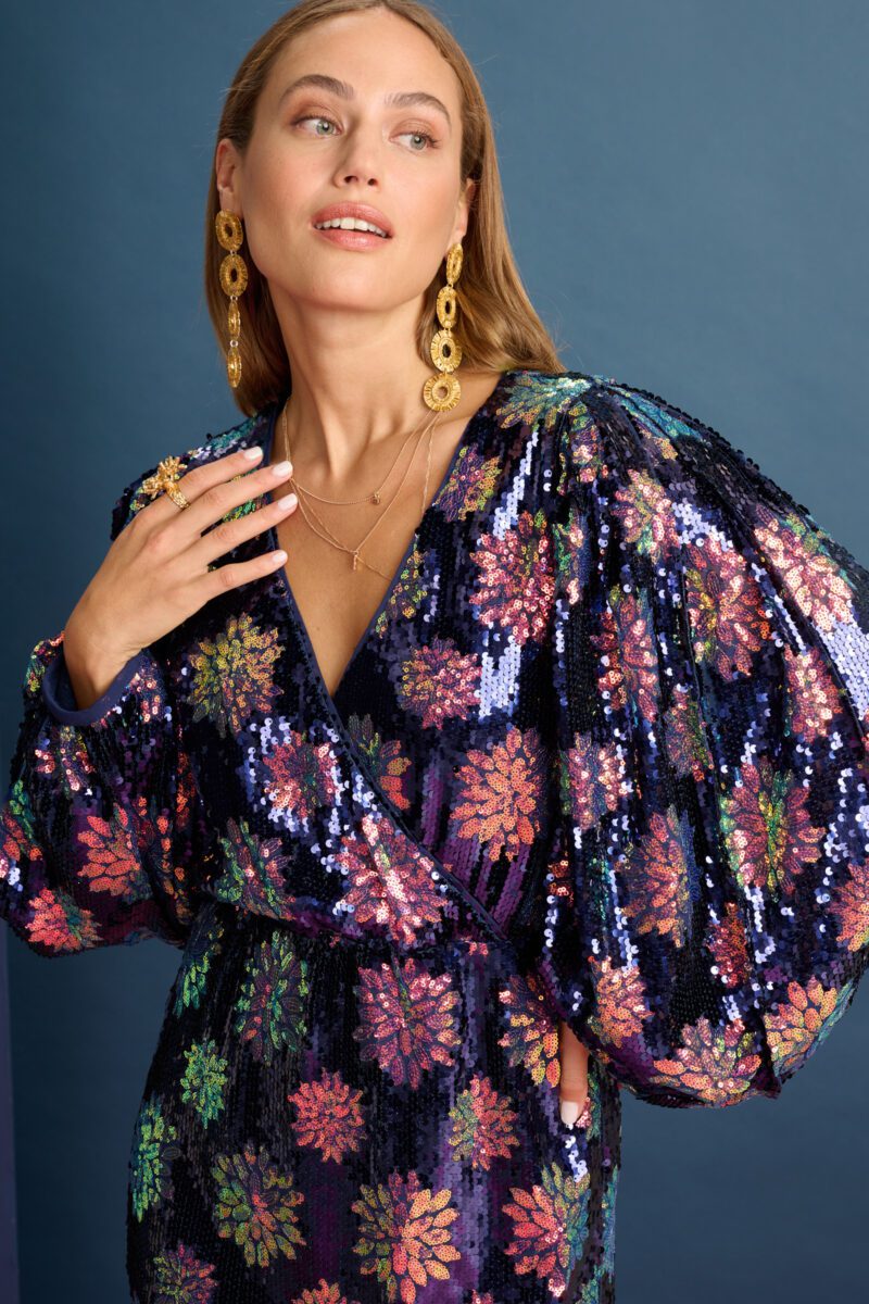 The most amazing dress by the fabulous brand, Pom Amsterdam. This is a real statement piece and simply perfect for parties. Beautifully detailed, this dress has a stunning pattern all over and is lined, has an elasticated waistband, beautiful sleeves, a deep v neck and cross over neckline.