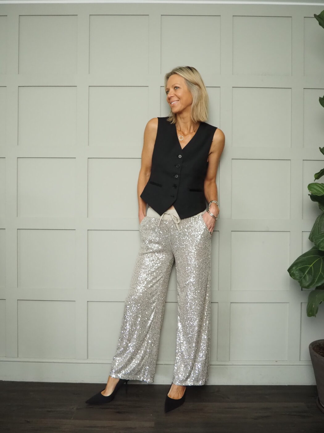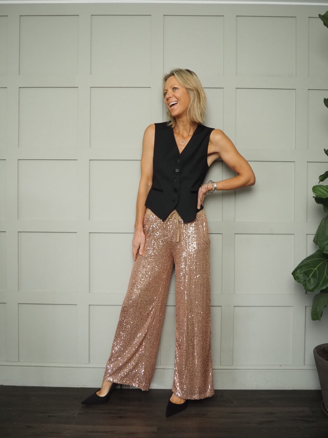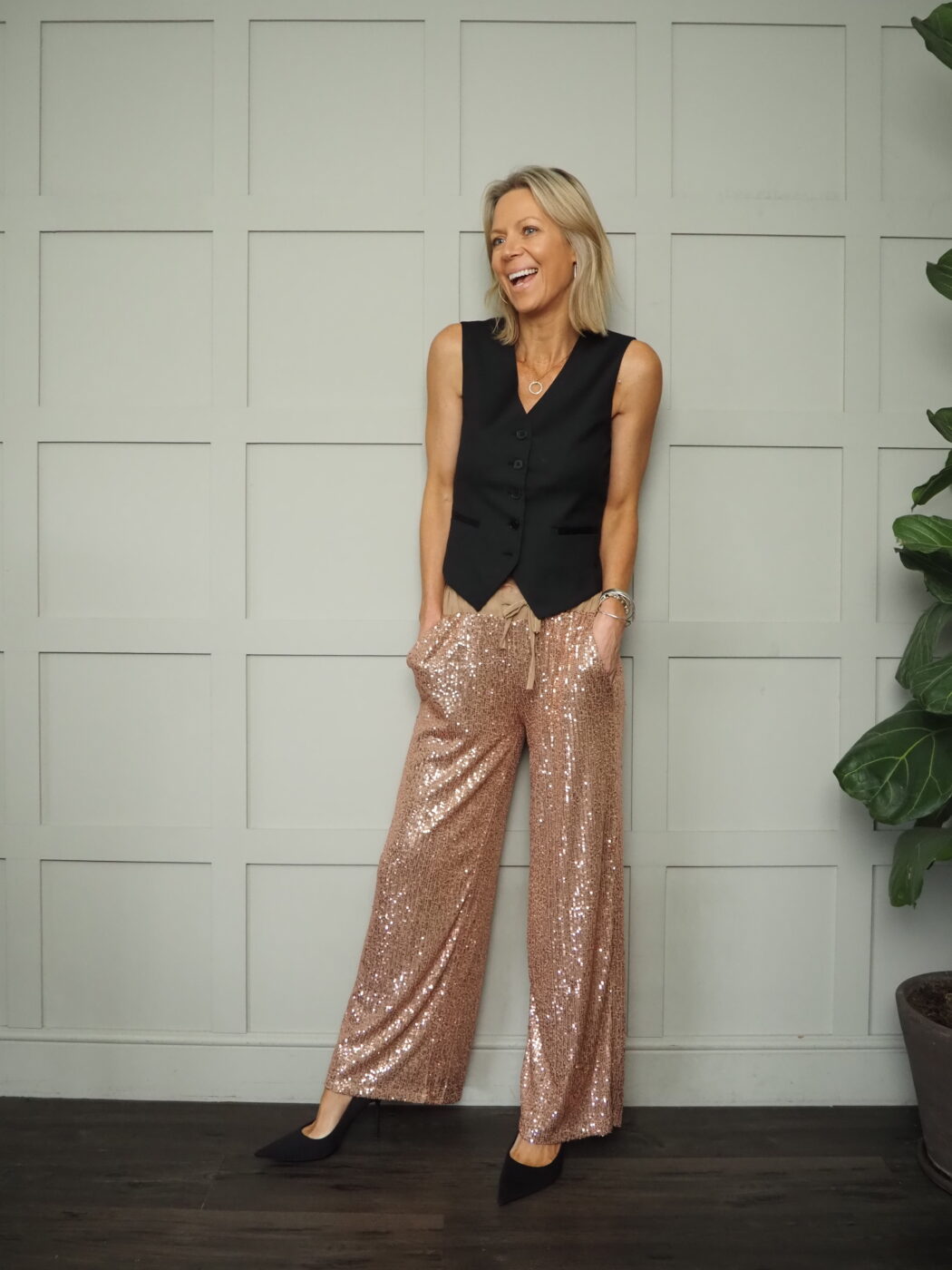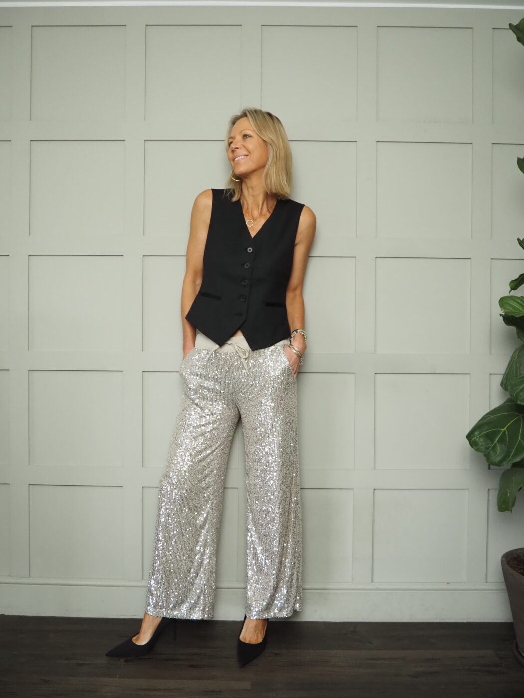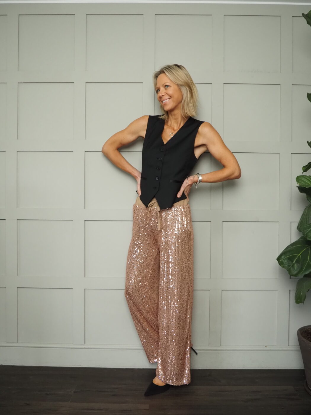 These sequin trousers are jogger in style, with an elasticated waist and a drawstring to tighten or loosen. Pockets to the sides and wide legs, fully lined, these can be dressed up with heels and down with trainers. Simply fab!