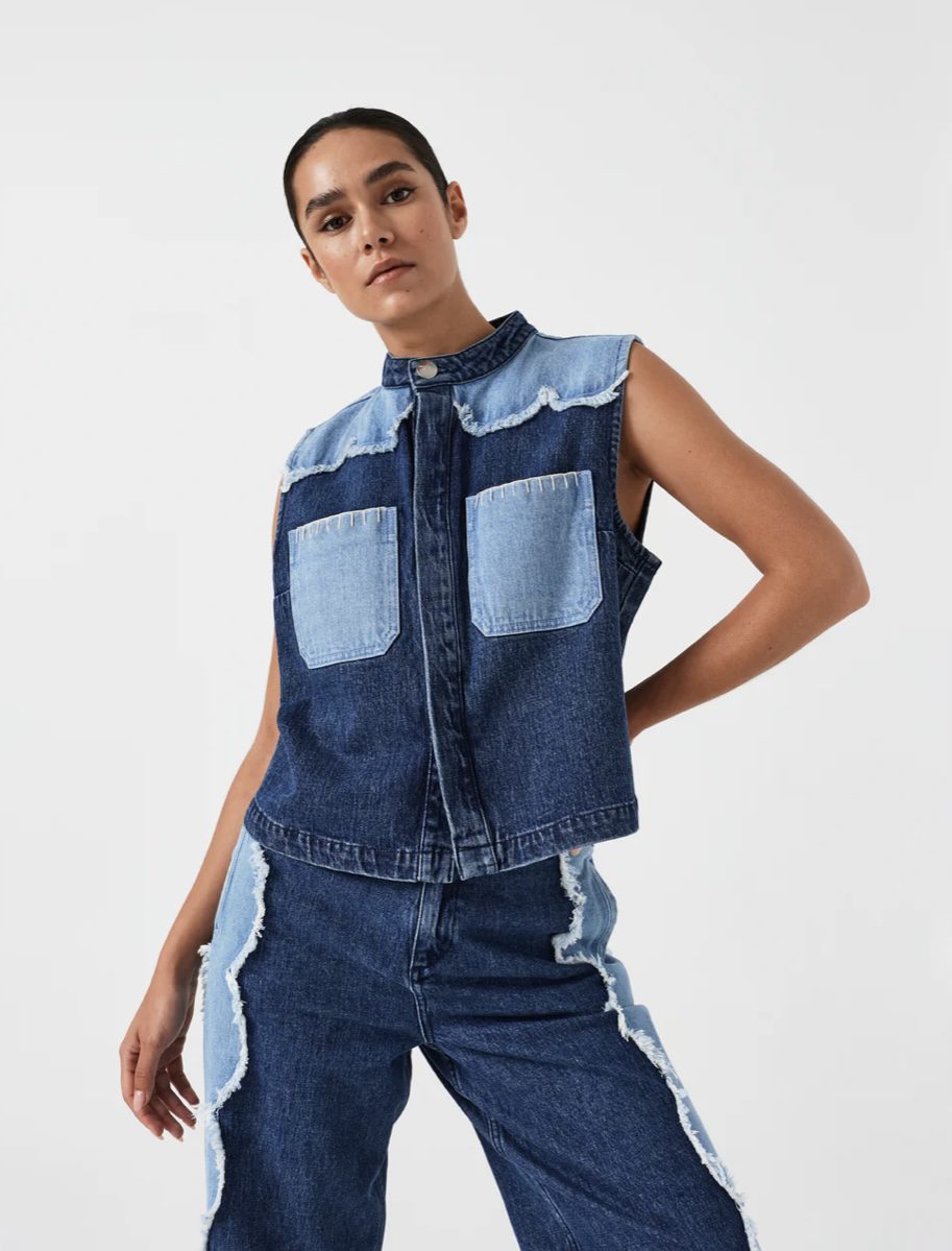 The perfect denim waistcoat with scallop frayed details and signature stitching on pockets.