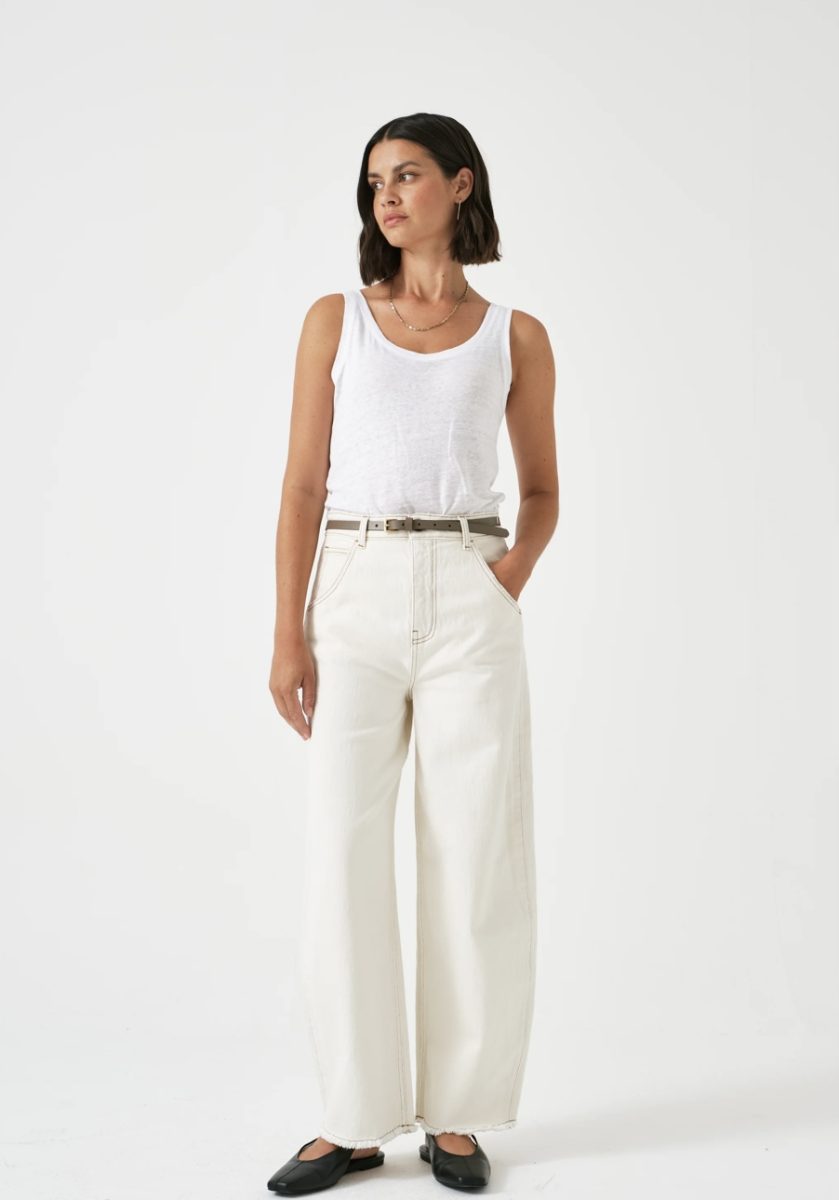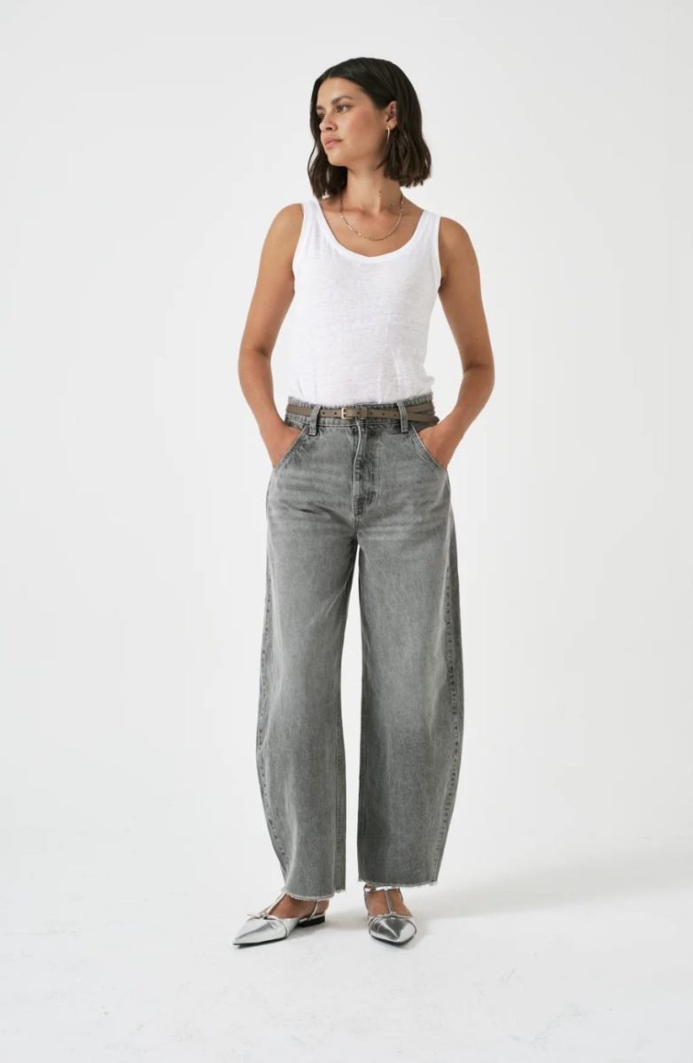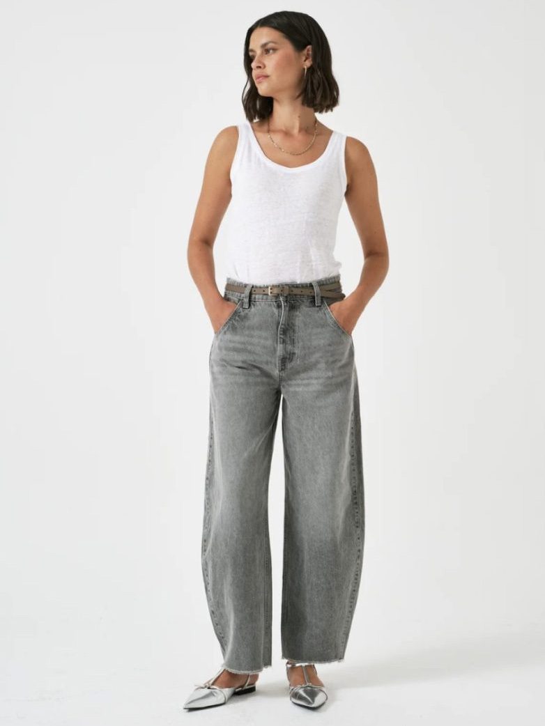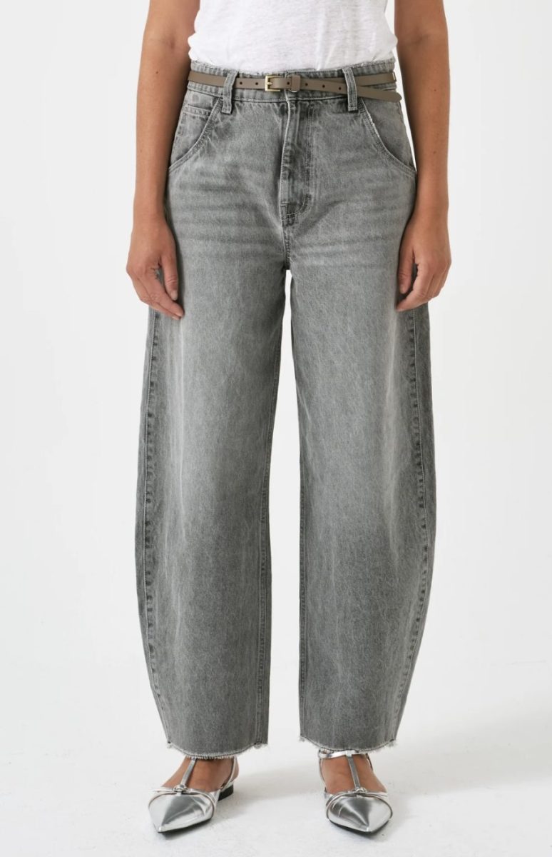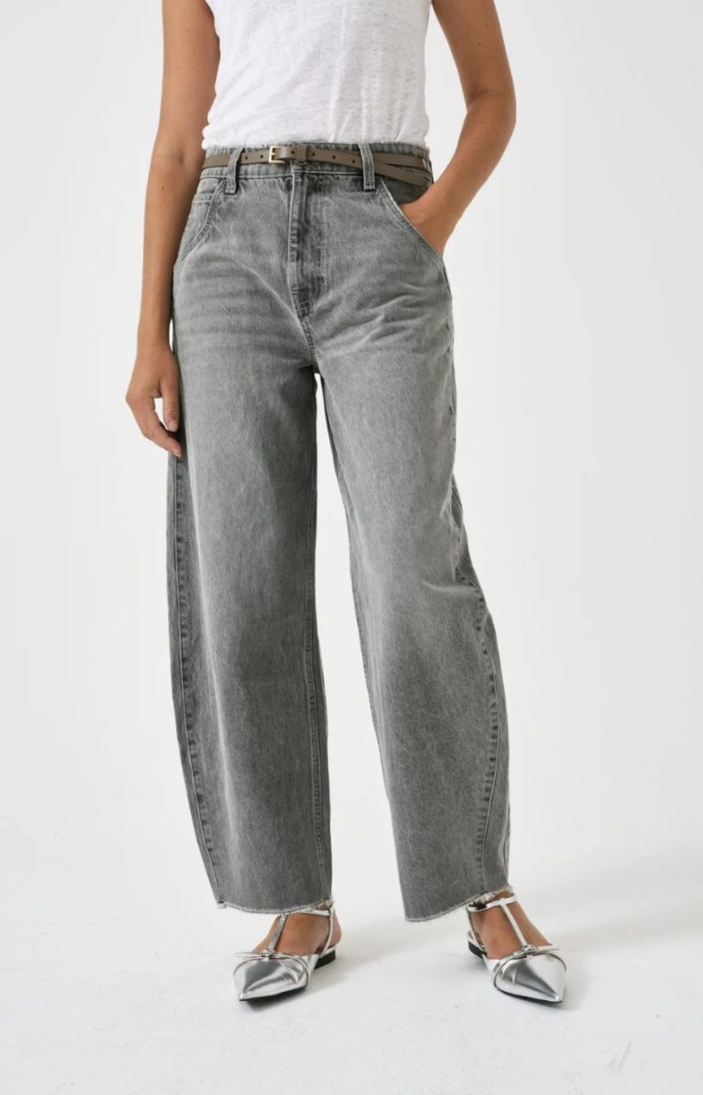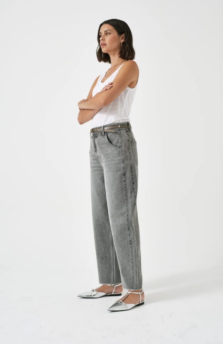 Freshen up your denim collection with these subtle barrel leg jeans. A perfect piece to add to your new season wardrobe. They work beautifully with boots but also look great with trainers or pumps so suit all seasons. Mid – high rise with a carpenter barrel leg and a frayed hem.Available in: Ecru and Vintage Steel, a washed, light grey denim.Sizing: Waist sizes 25 (UK 6-8), 26 (UK 8-10), 27 (UK 10-12), 28 (UK 12-14) and 29 (UK 14-16). Becky is a size 8-10 and 5’9” and wears the size 26.Measurements: front rise – 12.5″ / Inside leg – 26″.Composition: 94% certified organic cotton, 5% recycled cotton, and 1% eco-made elastane.
