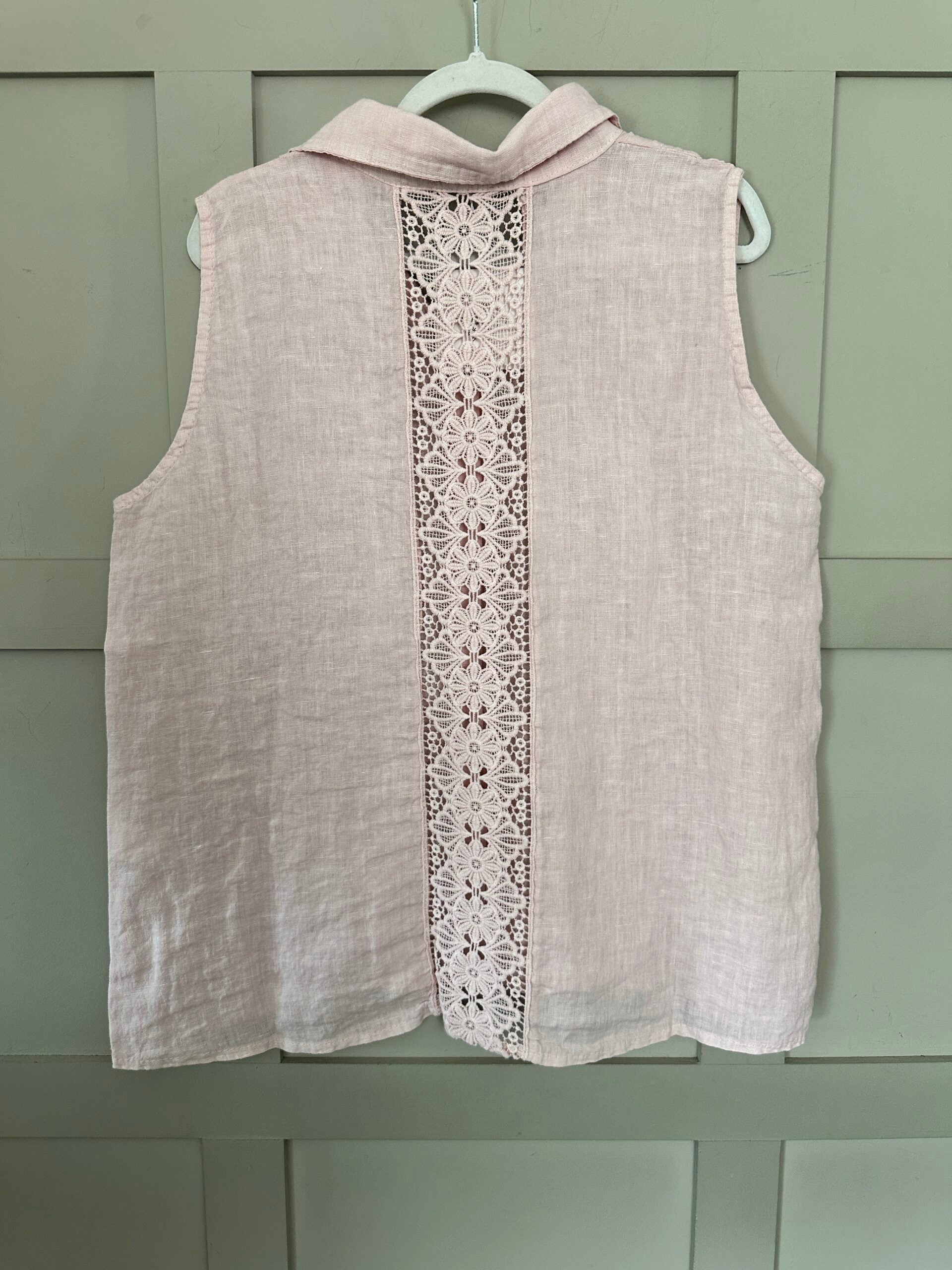 This is a fabulous linen offering – a sleeveless blouse with a collar, button fastening and lovely lace panel on the back. A loose, cool and comfortable piece which can be worn with jeans, trousers and shorts.