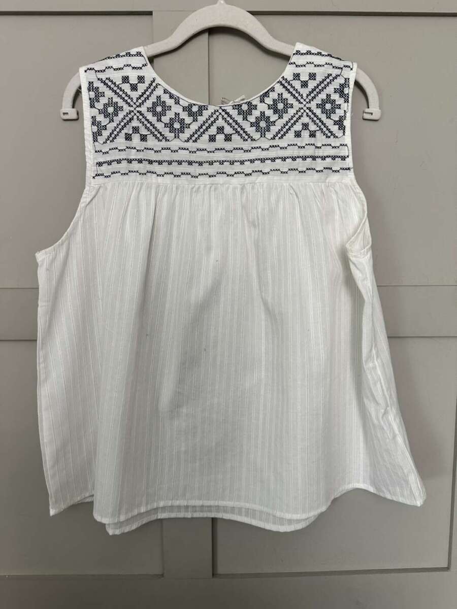 This sleeveless blouse is super cute with a gorgeous navy blue cross stitch embroidery detail across the chest. This blouse has very subtle gold and silver lurex stripes running through the fabric.