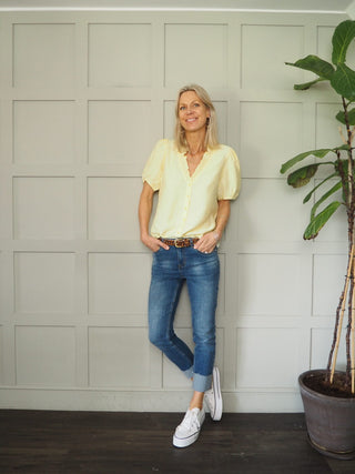 Elcot SHORT Sleeve Blouse with V Neckline and Frill Detail - Baby Blue, Black, Off White, Yellow