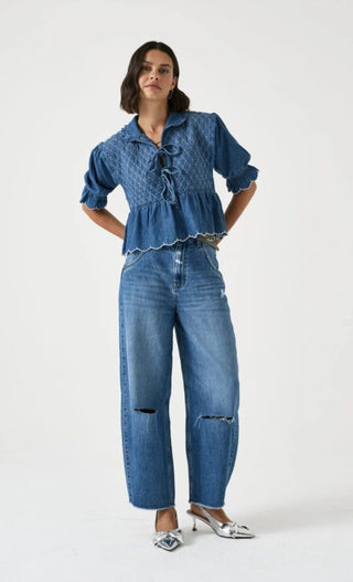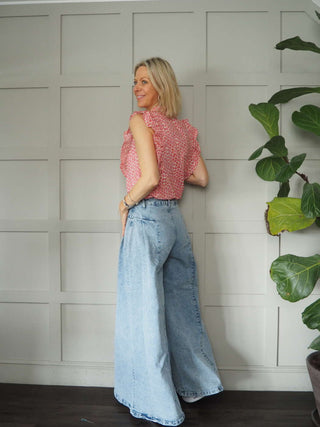 Heidi Short Sleeve Blouse with Tie Front & Frill Detail by Seventy Mochi - Mid Vintage Blue, Pink Dawn