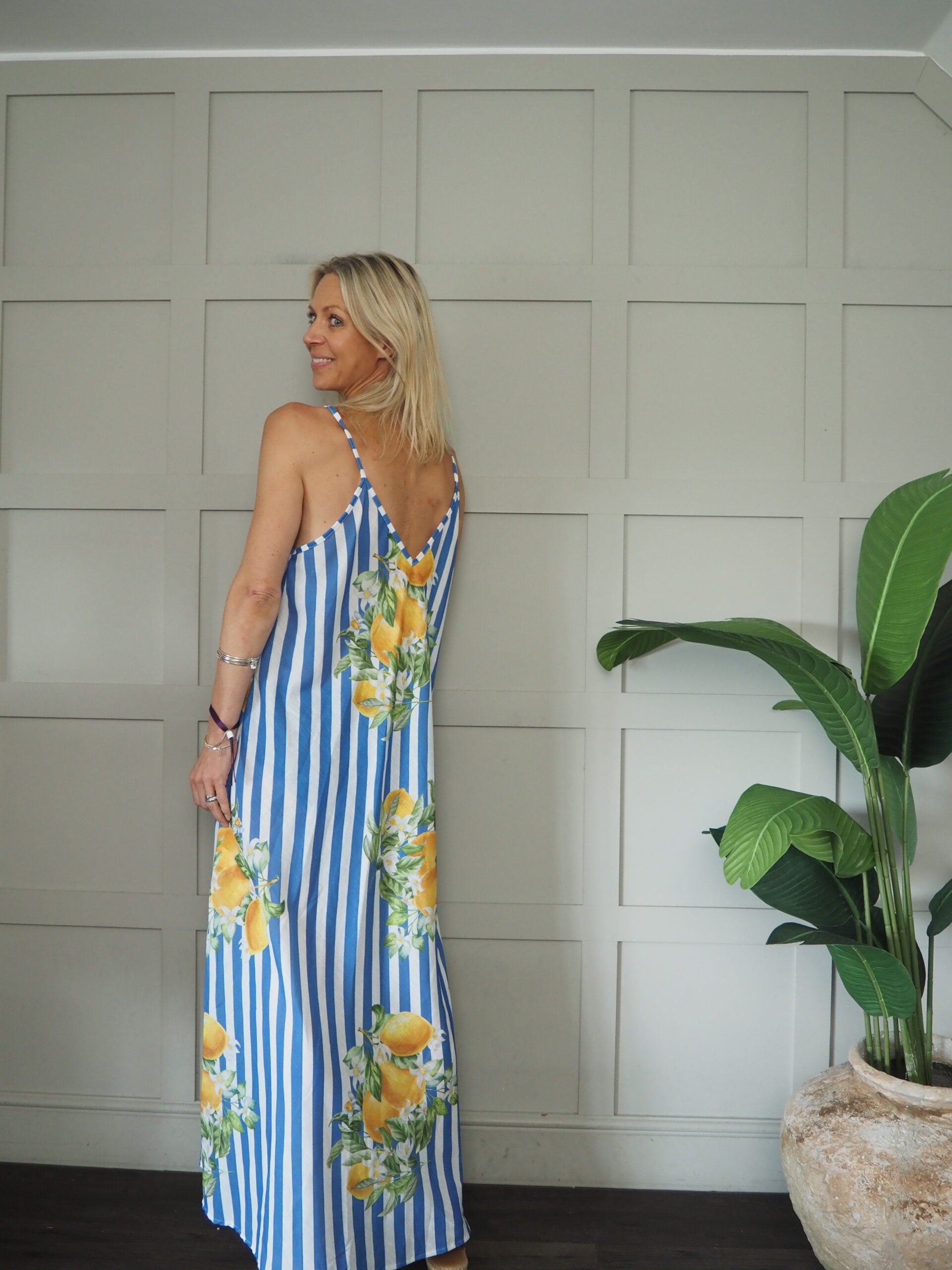 Available in: Blue and White Stripes with Yellow and Green lemon design.