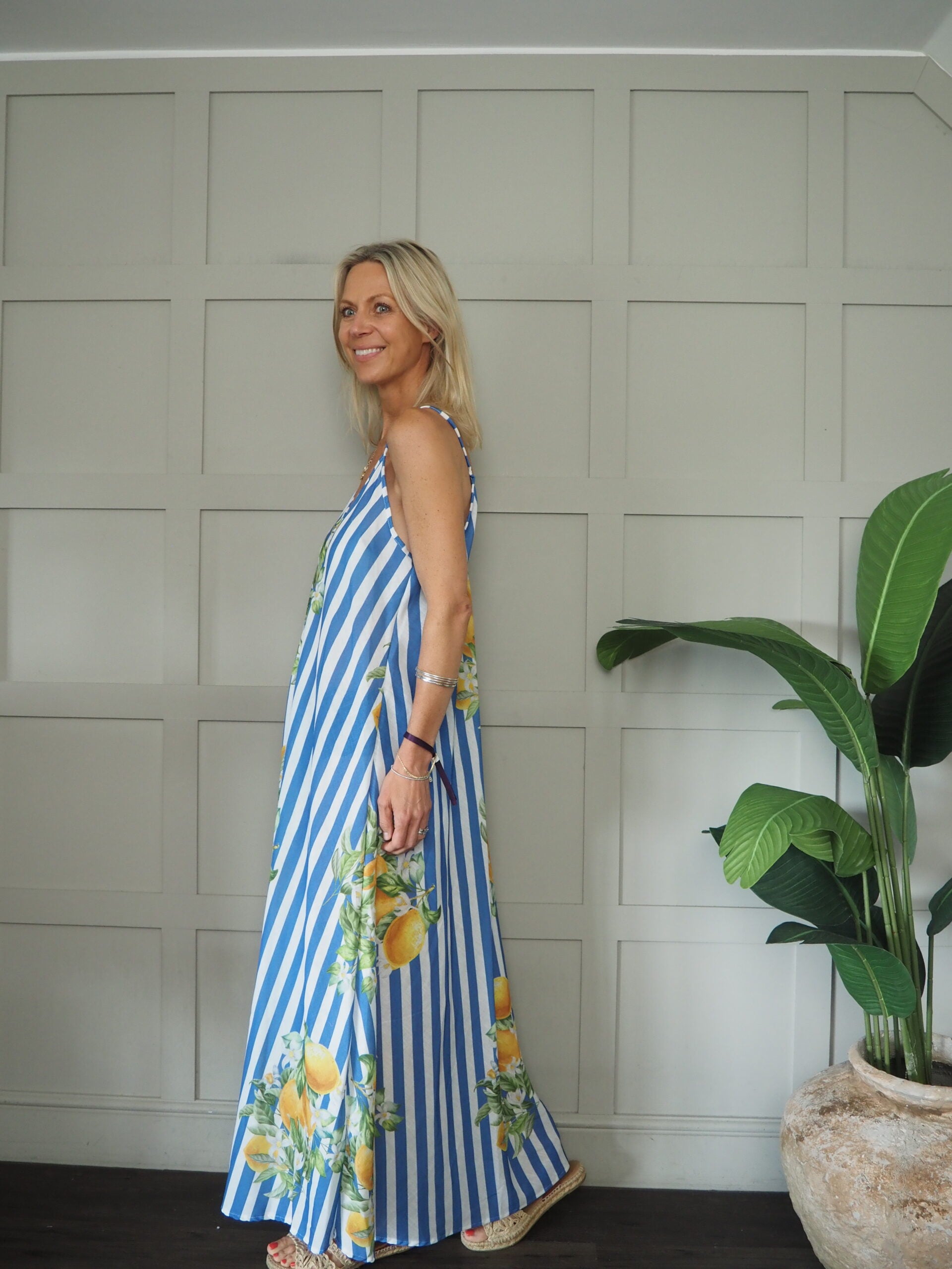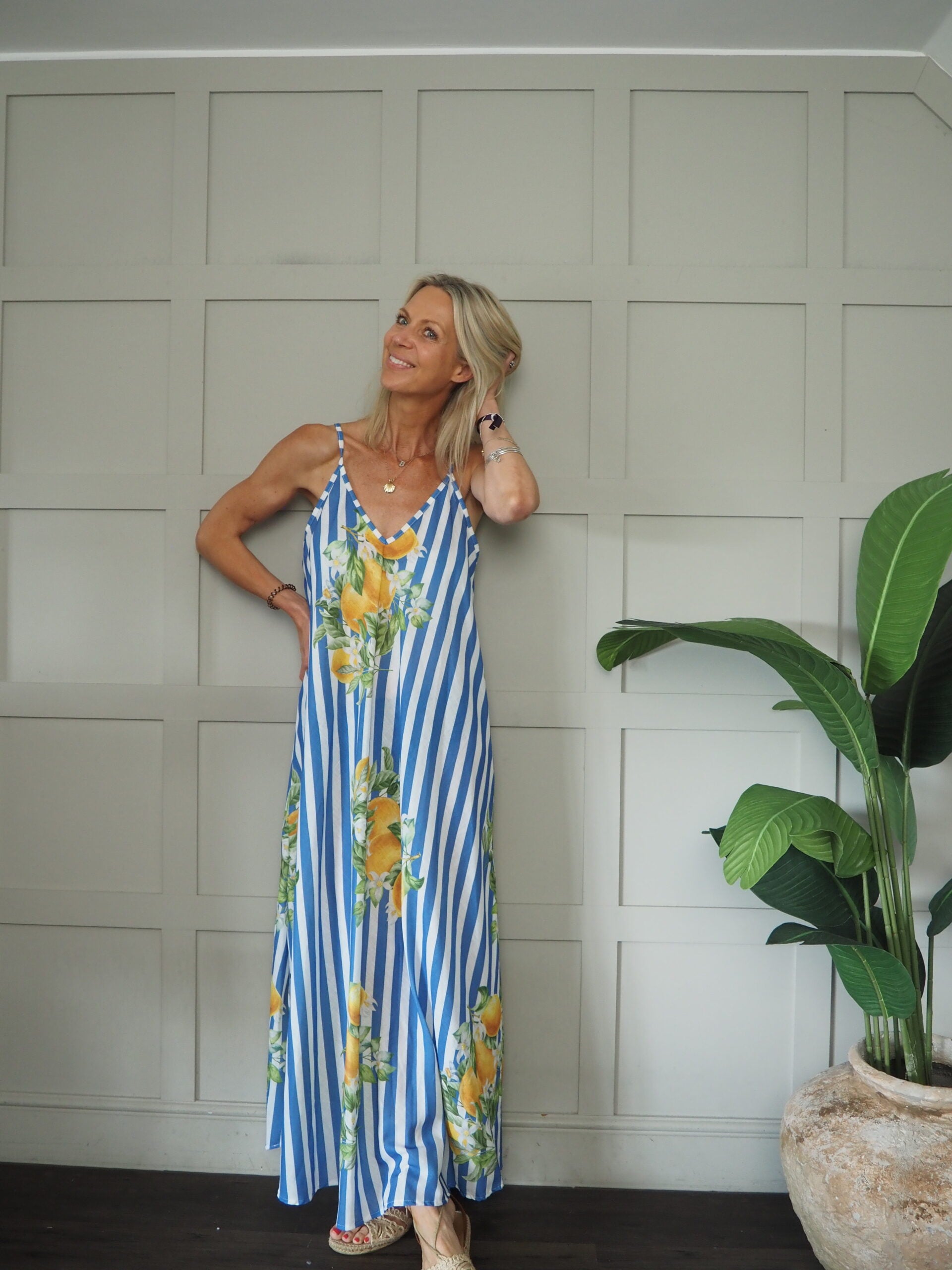 This bright and beautiful sundress is the perfect piece to pack in your holiday suitcase. It’s cool and comfortable and can be worn in the city or on the beach. It has a V neckline at the front and back with shoestring straps.