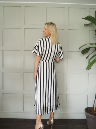 Clero Short Sleeve Satin Dress by Soaked - Black/Off White Stripes
