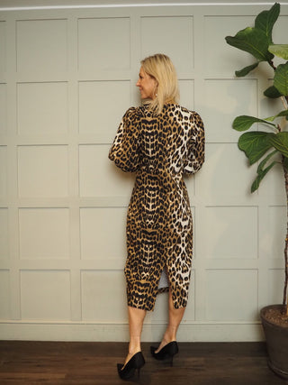 Xala Round Neck Short Sleeved Midi Dress with Puff Sleeves - Leopard Print