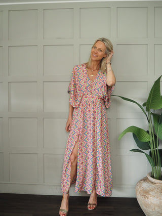 Kiara Silky Feel Maxi Dress with Angel Sleeves - Multicoloured