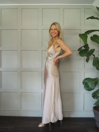 Elena Satin, V-Front, Maxi Camisole Dress with Adjustable Spaghetti Straps - Taupe