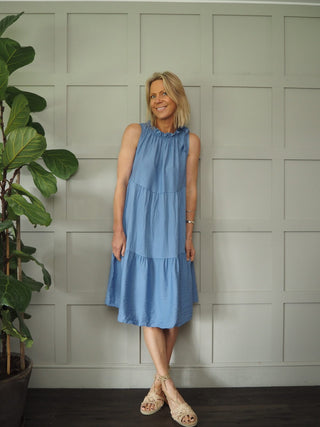 Kaseyli Dress with Shoulder Tie and Tiered Hem - Aqua, Sky Blue, Stone, White