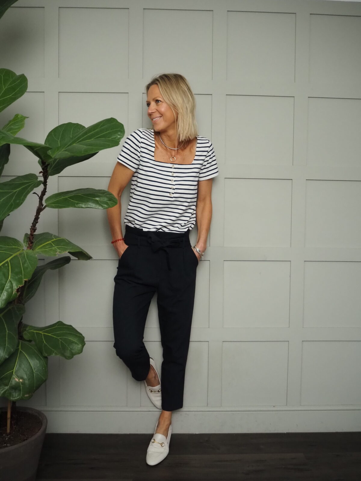 100% cotton, short sleeved T Shirt featuring 5 tortoise shell buttons at the front. Beautiful square neck style.