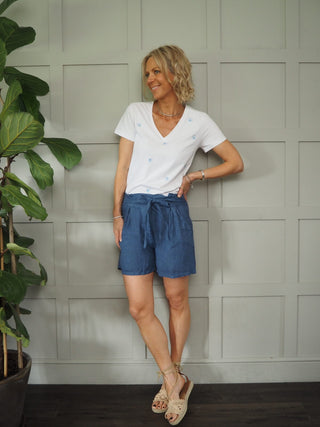 Mills Denim Shorts with Scalloped hem and Embroidery Detail - Light Denim Blue