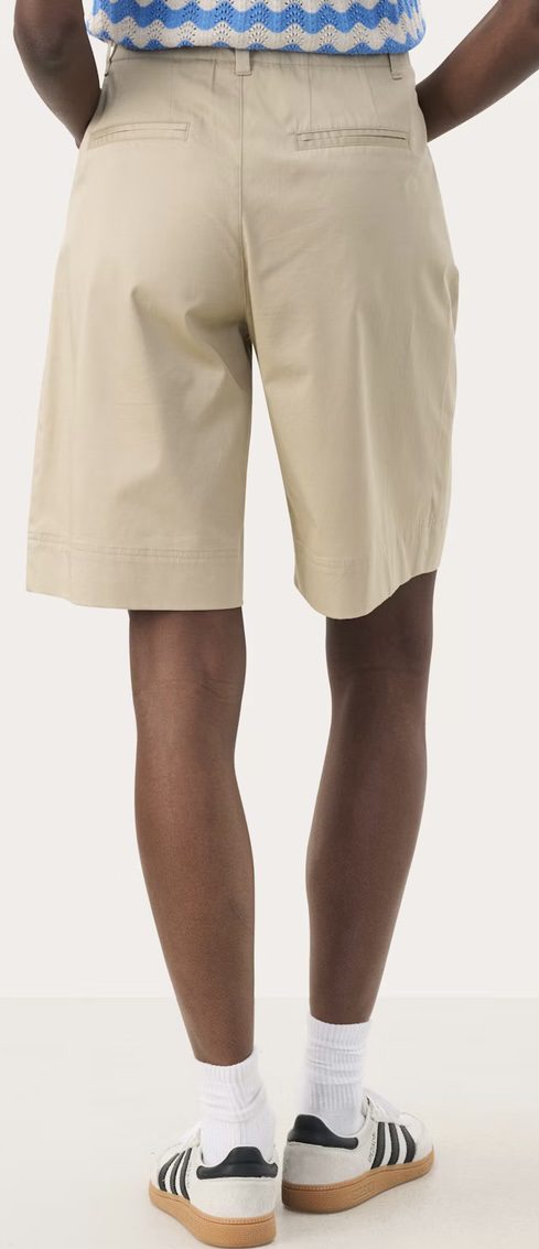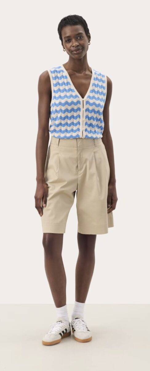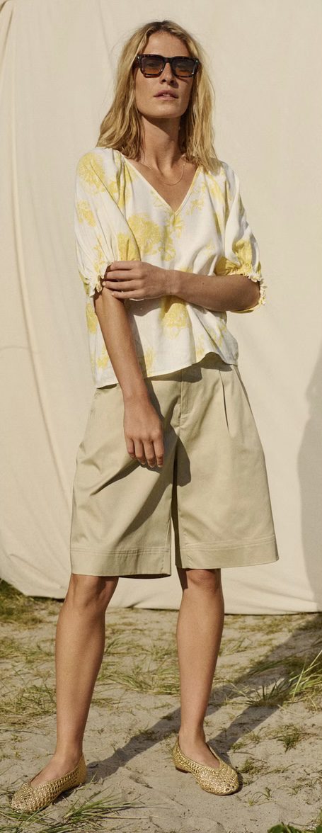 This is a timeless pair of tailored shorts with wide legs, belt loops, pockets to the sides and faux pockets to the rear. The fastening is a hook and eye and zip and there are pretty pleats at the front.