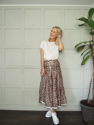 Talia Leopard Print Skirt with Fringing Detail on the Hem - Chocolate/Off White