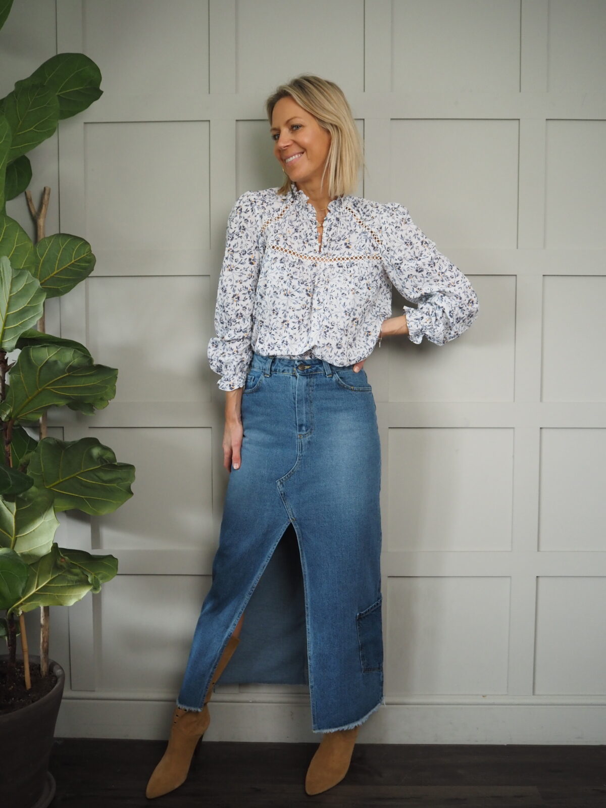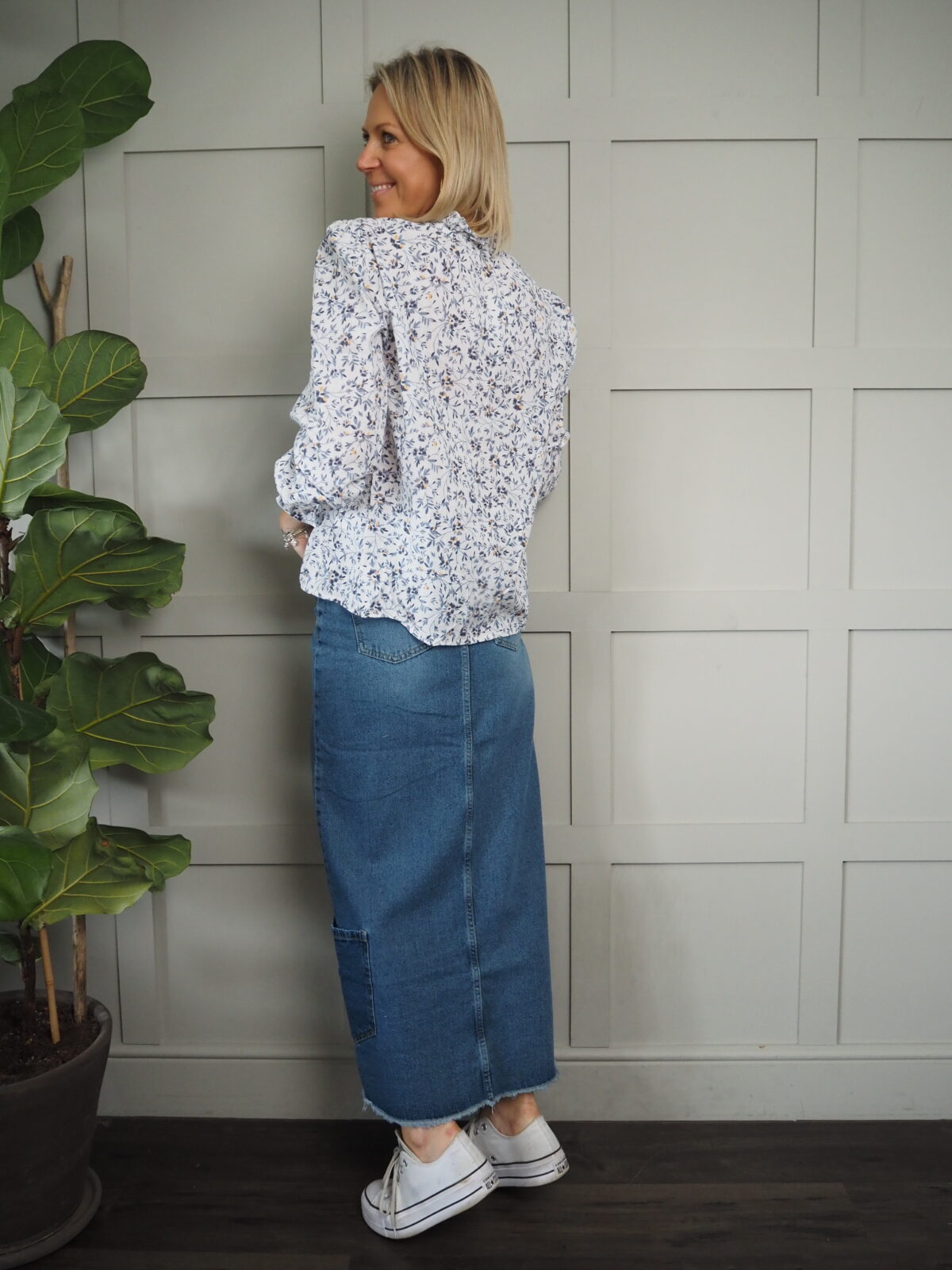 An amazing 70’s inspired maxi skirt. Pockets to the sides, rear and a single pocket at the bottom left hand side. Raw hem and a high split at the front.