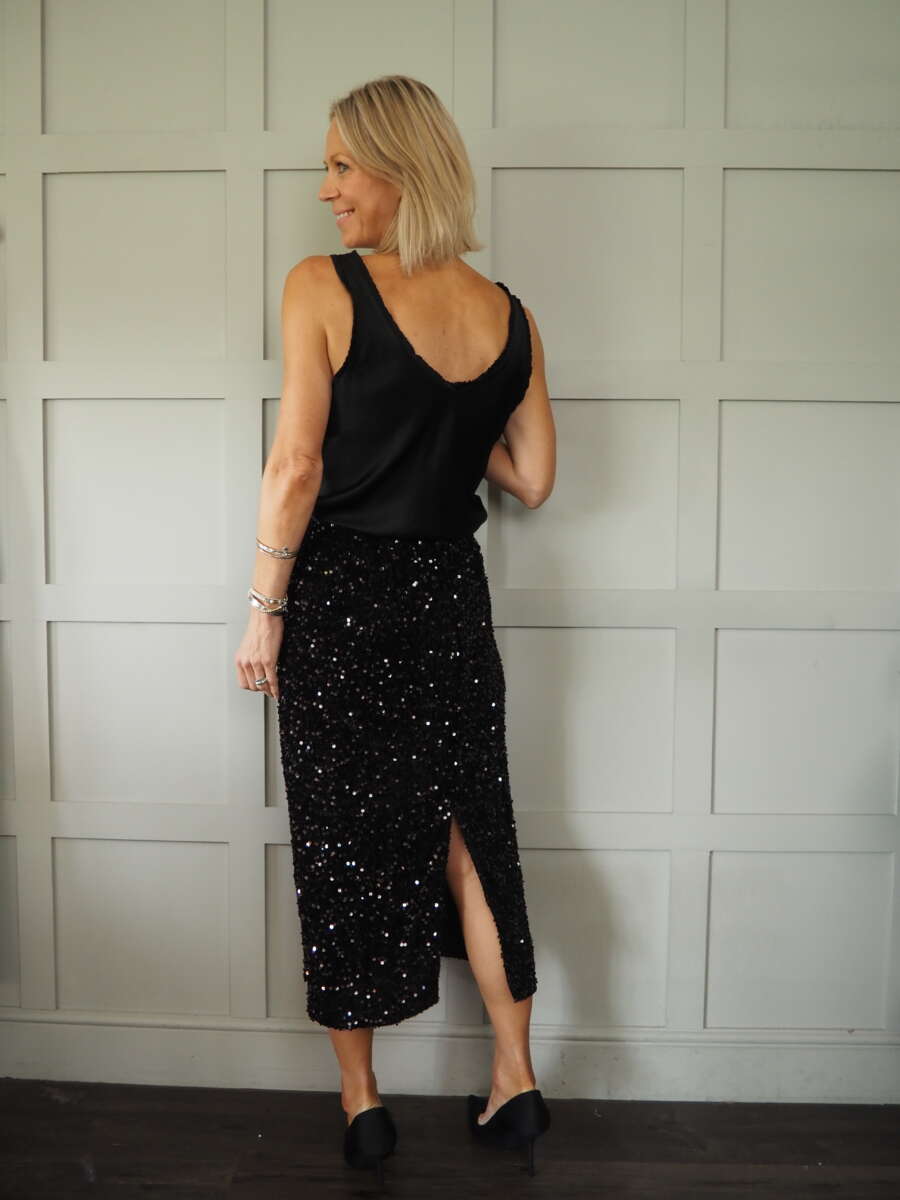 These fabulous sequin skirts are perfect for all year round. They are a fun piece which can be worn casually with chunky boots, a knit & a leather jacket but they are obviously fabulous dressed up for a special occasion, a night out or party season! This statement sequin skirt has a slit at the back and would work on a variety of heights.
