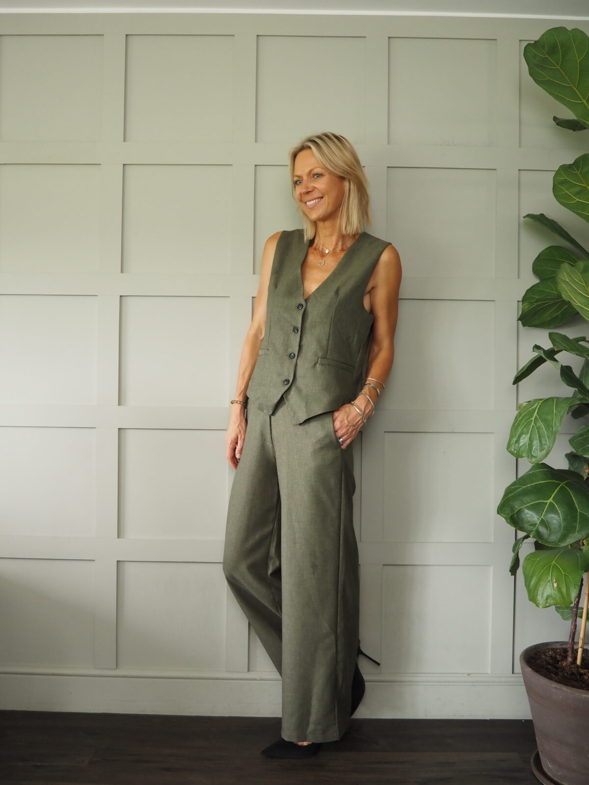 Newly Waistcoat & Wide Leg Trouser Set - Khaki and Mushroom