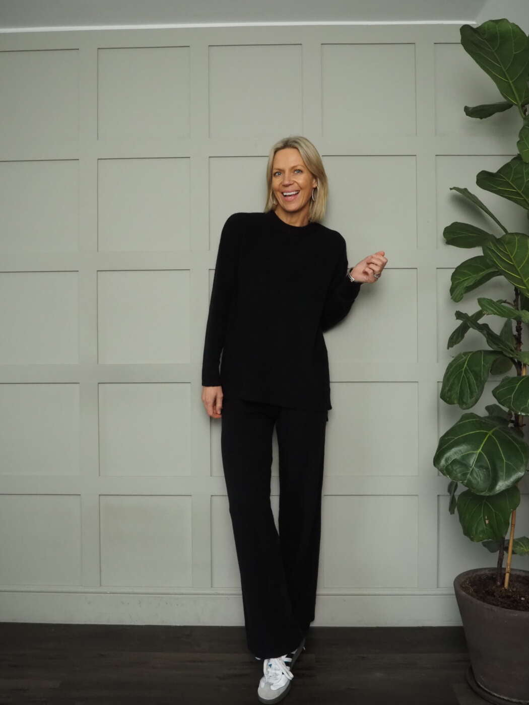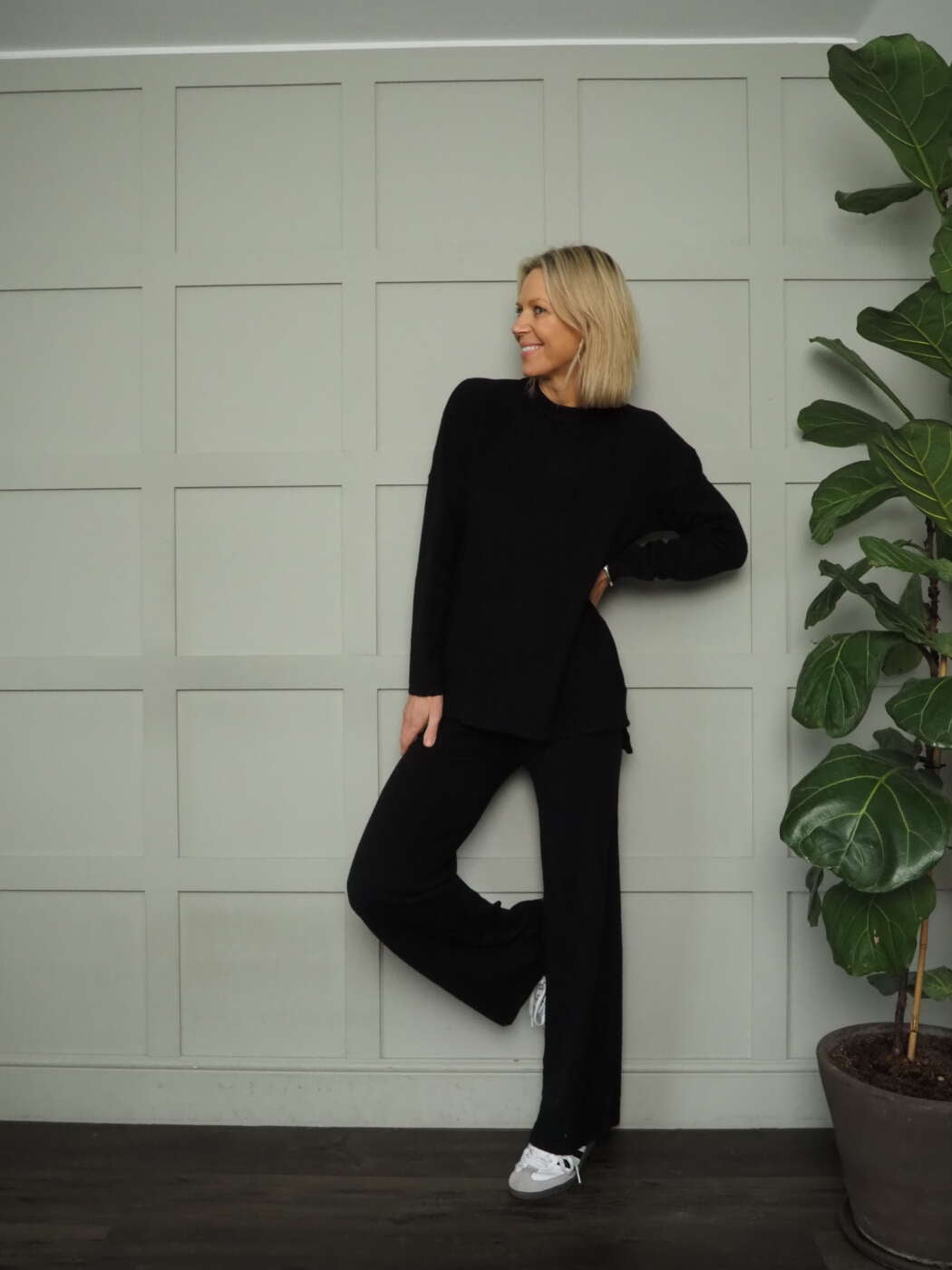 Perfect lounge set! So soft, cosy and comfortable. Jumper is round necked, slightly longer at the back with small slits at the side, long sleeved. Trousers are wide legged with ribbed hems, elasticated waist.