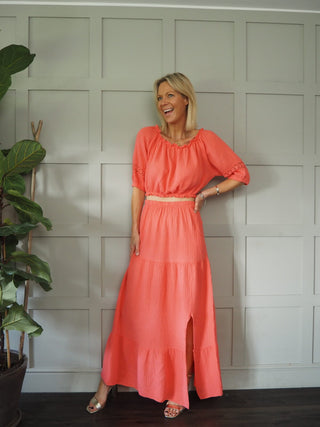 Babette Cheesecloth Maxi Skirt and Top Set - Black, Bright Orange, Coral and Khaki