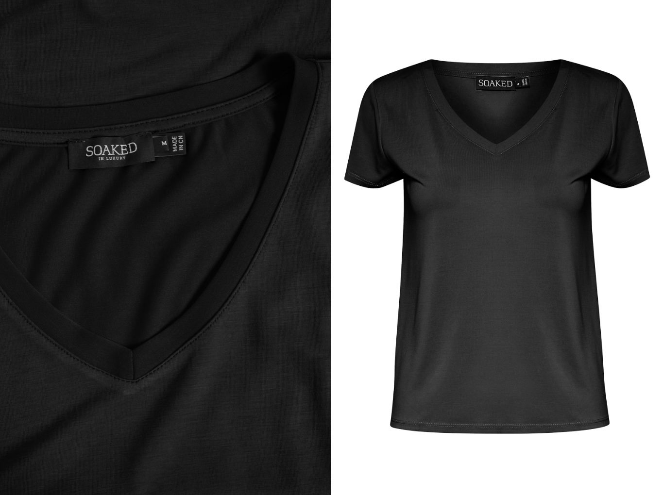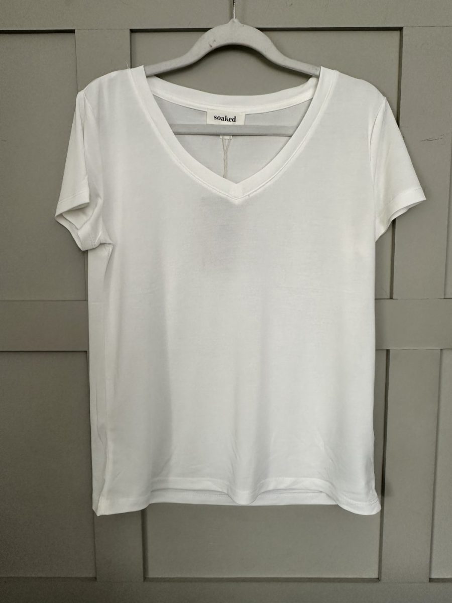This is a fantastic wardrobe staple – being a modal mix it feels so beautiful to wear and is such a great cut. Silky soft, this will be worn on repeat! It has a V neck and short sleeves. Also available in a crew neckline Columbine Silky Soft CREW Neck T Shirt by Soaked – Off White