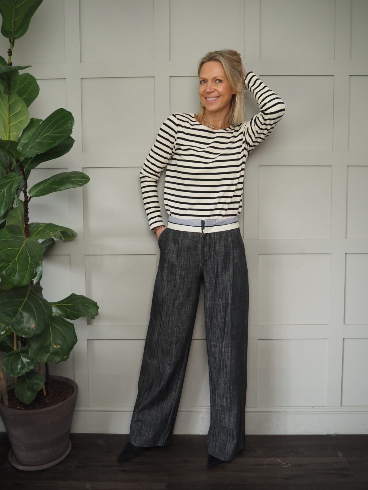 Worn with the Wispa Cotton Wide Leg Trousers with Stripy & Cream Waistband – Black.