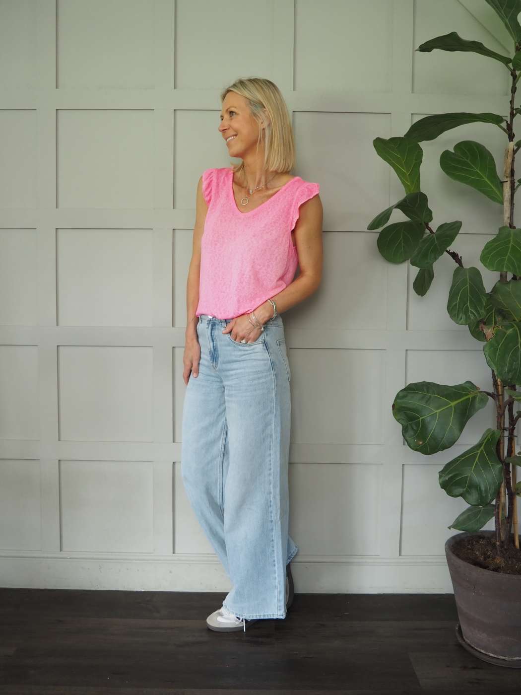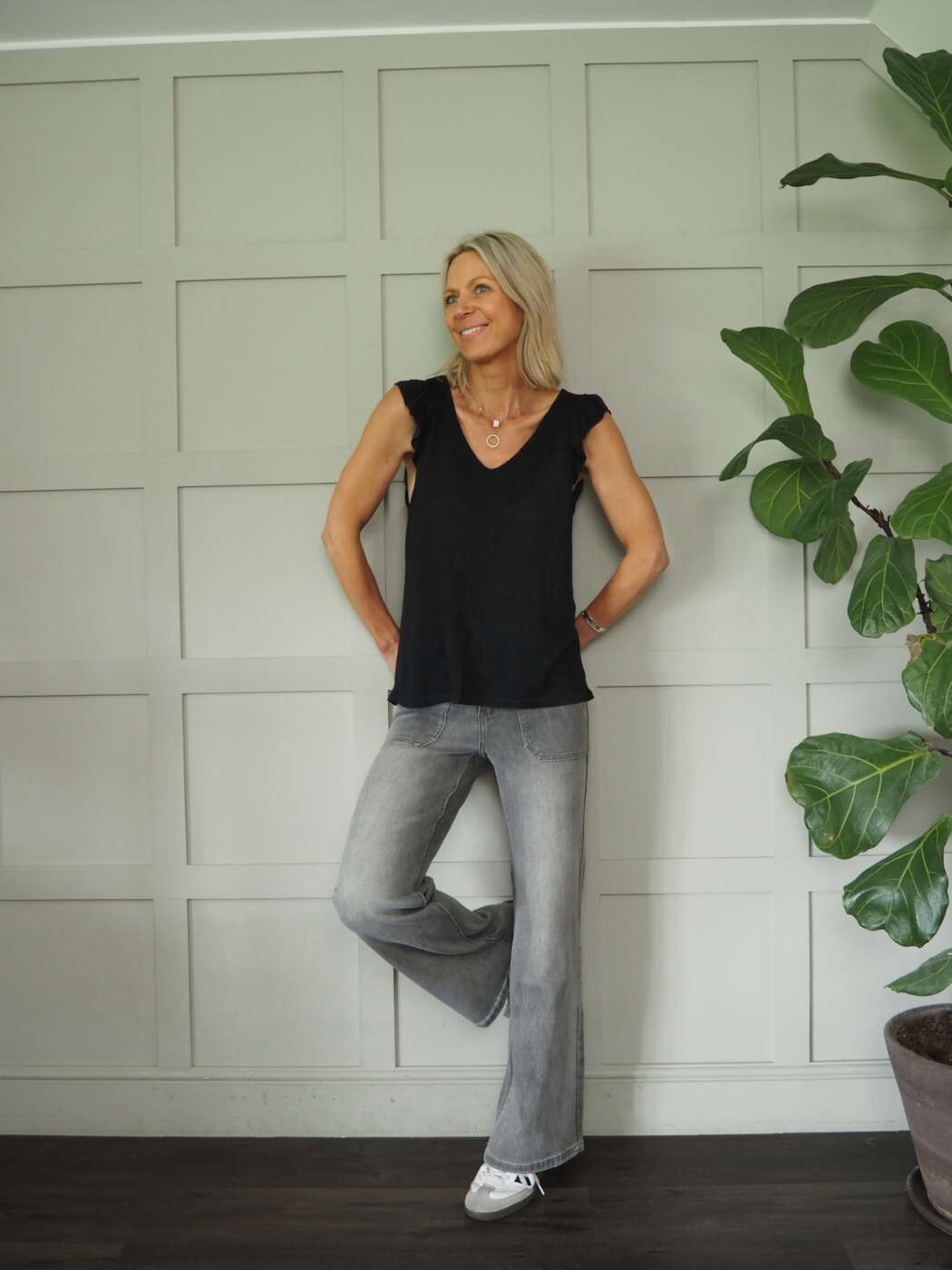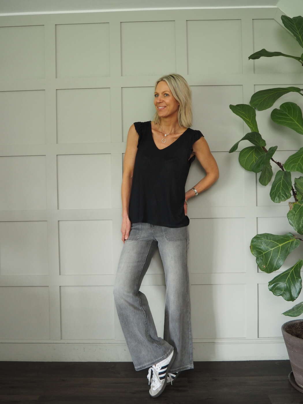 Classic T Shirt, this is just a true wardrobe must-have! It has a v neck and frilly capped sleeves and is a relaxed shape.