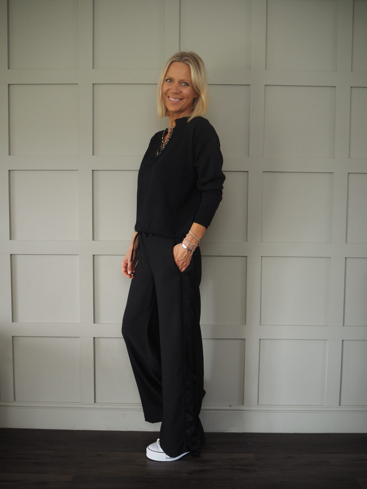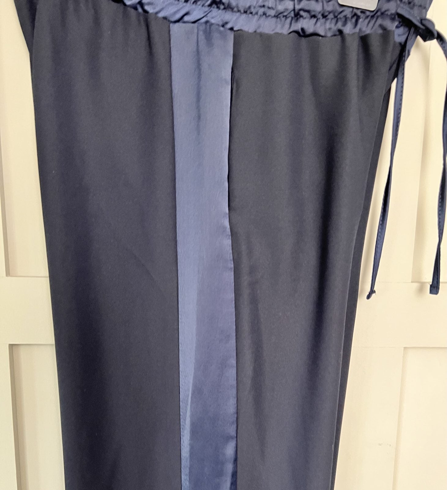 These fabulous crepe style wide leg trousers with contrasting satin side stripe, an elasticated satin waist with satin drawstring, pockets and a split hem on both legs. The trousers are really flattering and hang beautifully without clinging. Super easy to wear, perfect for parties and can be dressed up or down.