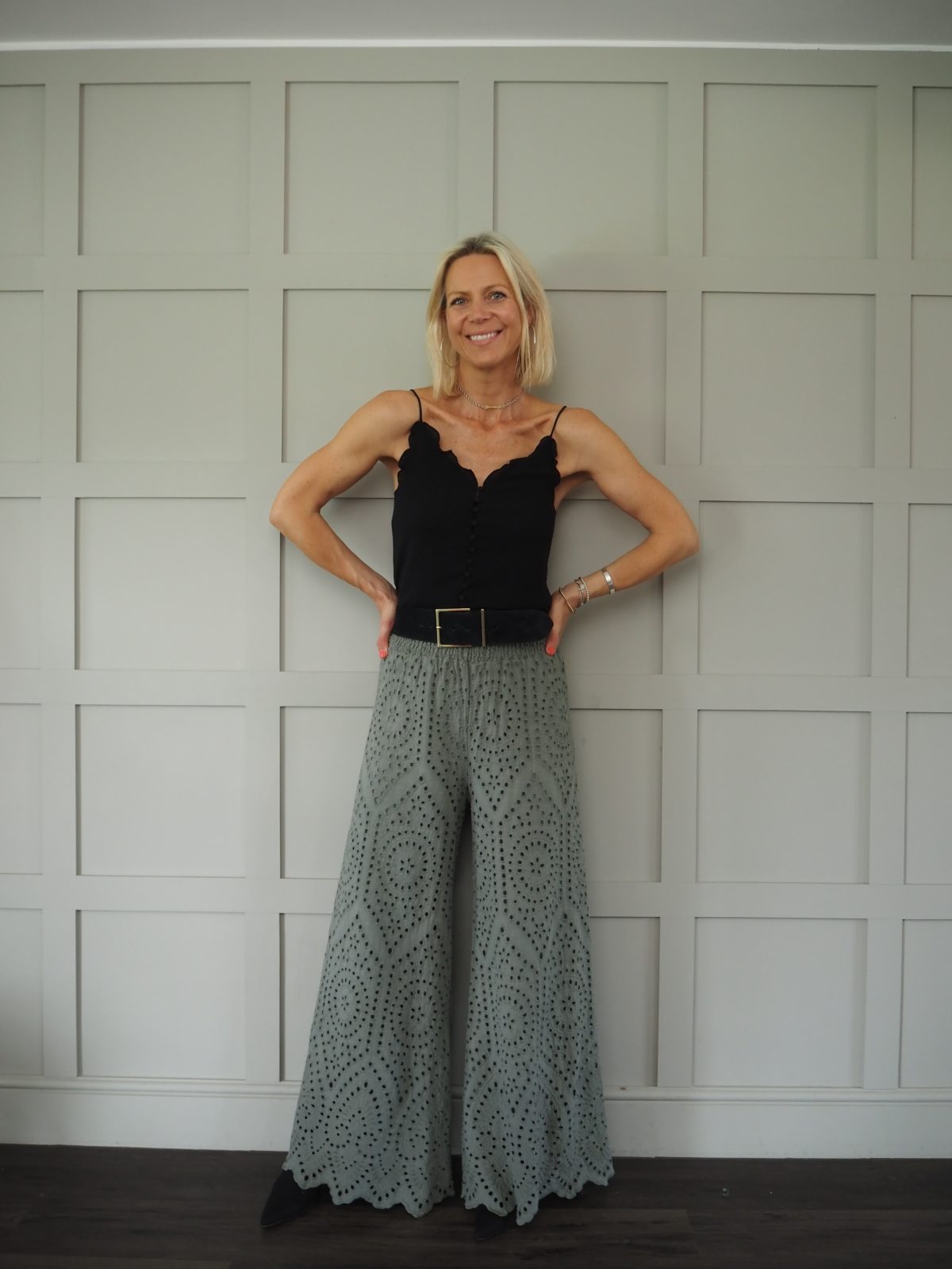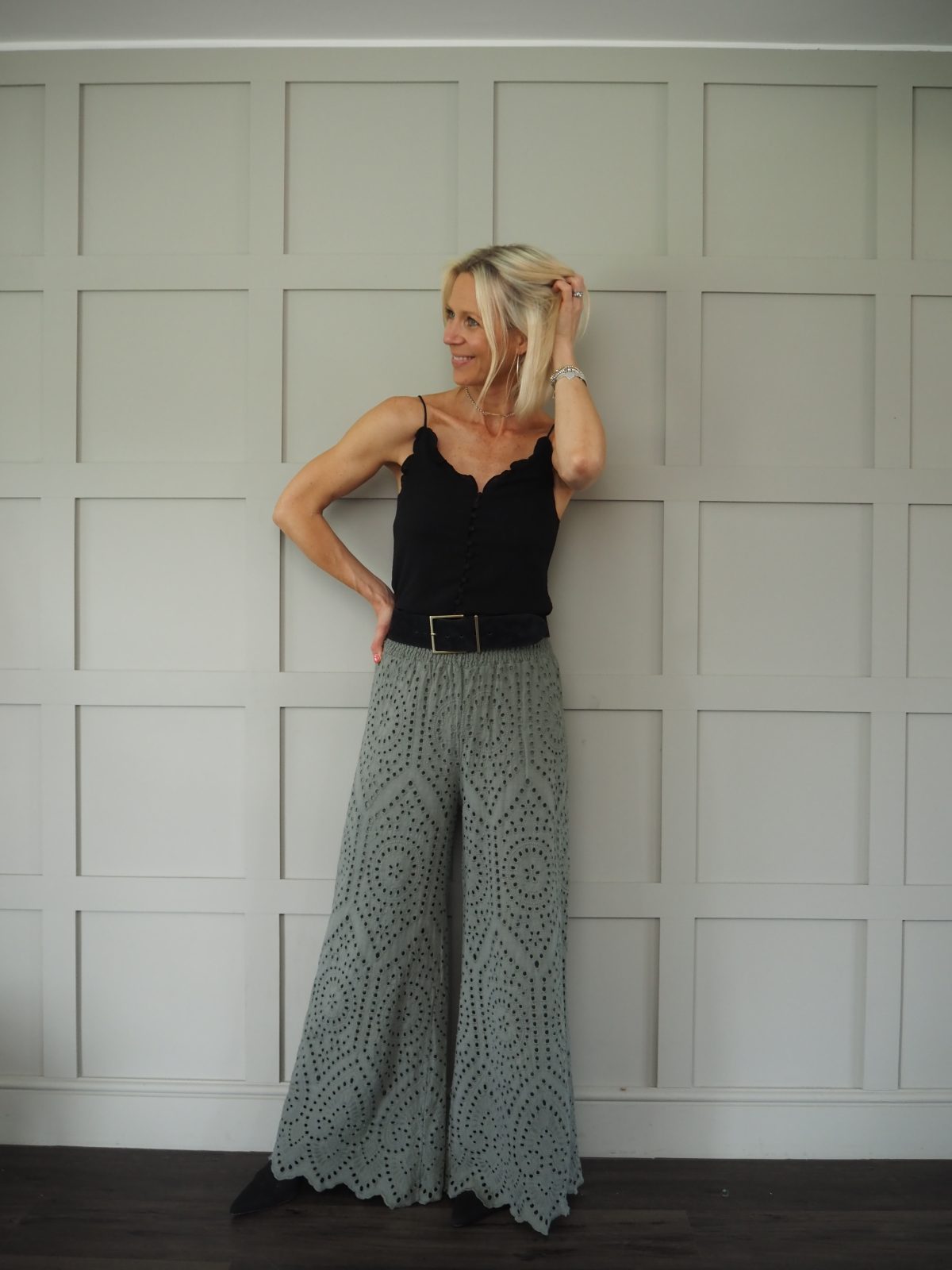 Fabulous, incredibly comfortable and super useful wide leg, cotton mix broderie anglaise trousers. Fully lined with elasticated waist. They look great worn casually with a T shirt or worn more smartly with a top and heels.