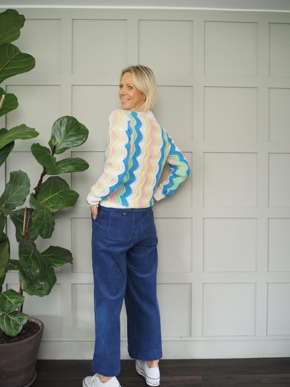 These fab cropped, wide legged, blue cords have a single button fastening at the front with a zip. Elasticated waistband at the back. Deep side pockets and pockets with a button to the rear.