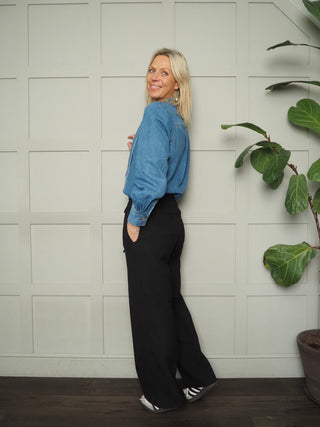 Nichelle Wide Leg Trousers with Side Zip and Button Fastening by Moss Copenhagen - Black