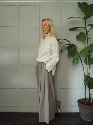 Griff Cable Knit Polo Neck Jumper with Ribbing Detail, Side Slits By Moss Copenhagen - Oatmeal