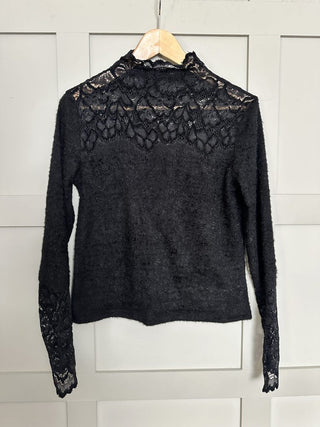 Eloisa Soft Jumper with Lace Cuffs and Collar - Black and Off White