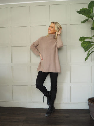 Aletta Long Line Polo Neck with Ribbing Detail - Black and Taupe