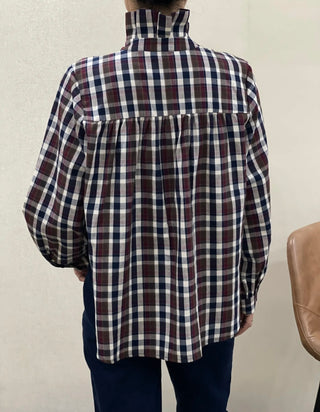 Rigby Check Blouse with Pleated Collar - Burgundy/Ecru/Navy