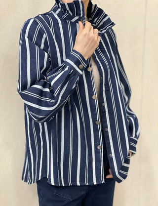 Heron Stripe Denim Shirt/Shacket with High Ruffle Collar - Navy Blue/Light Blue