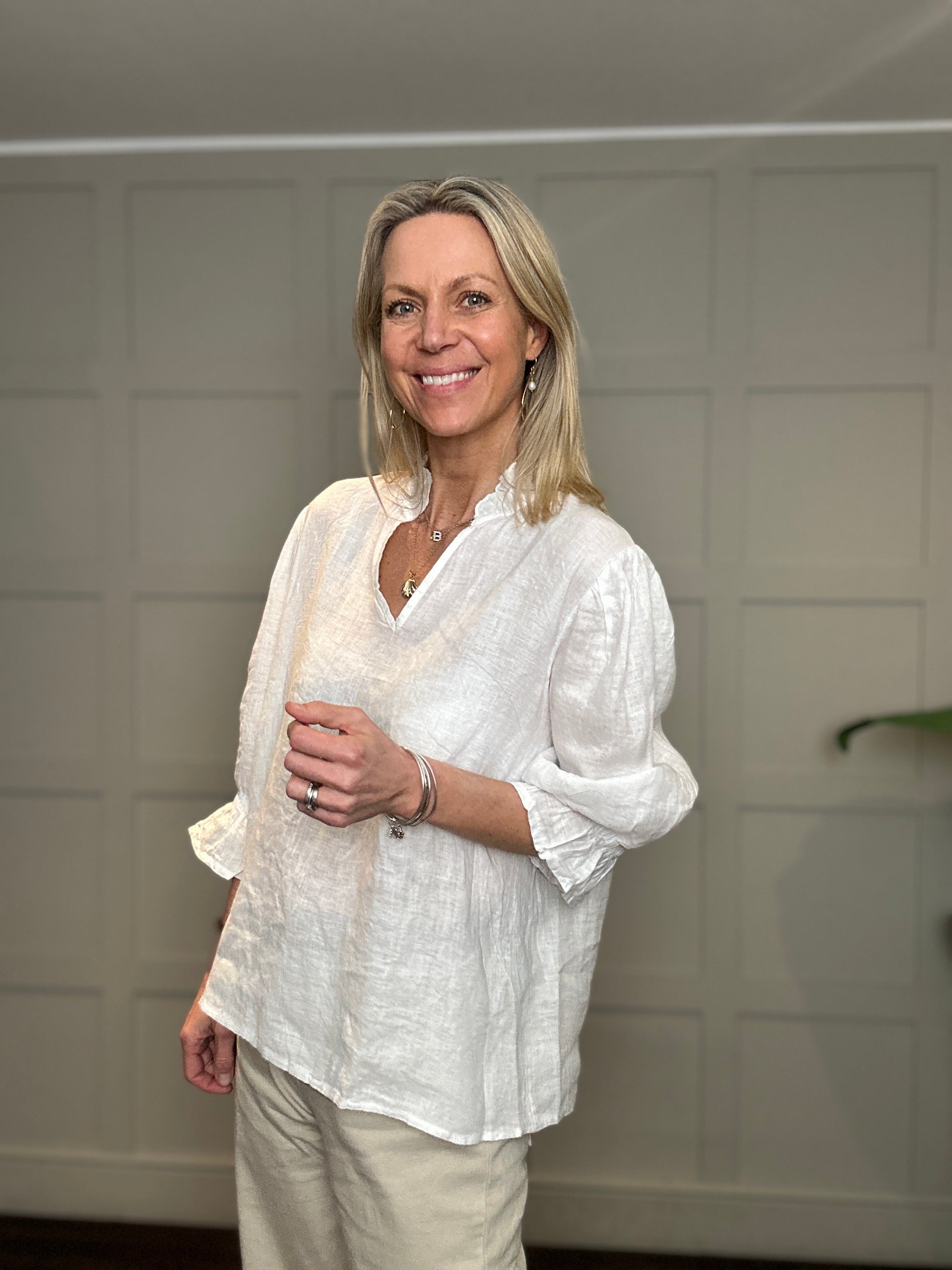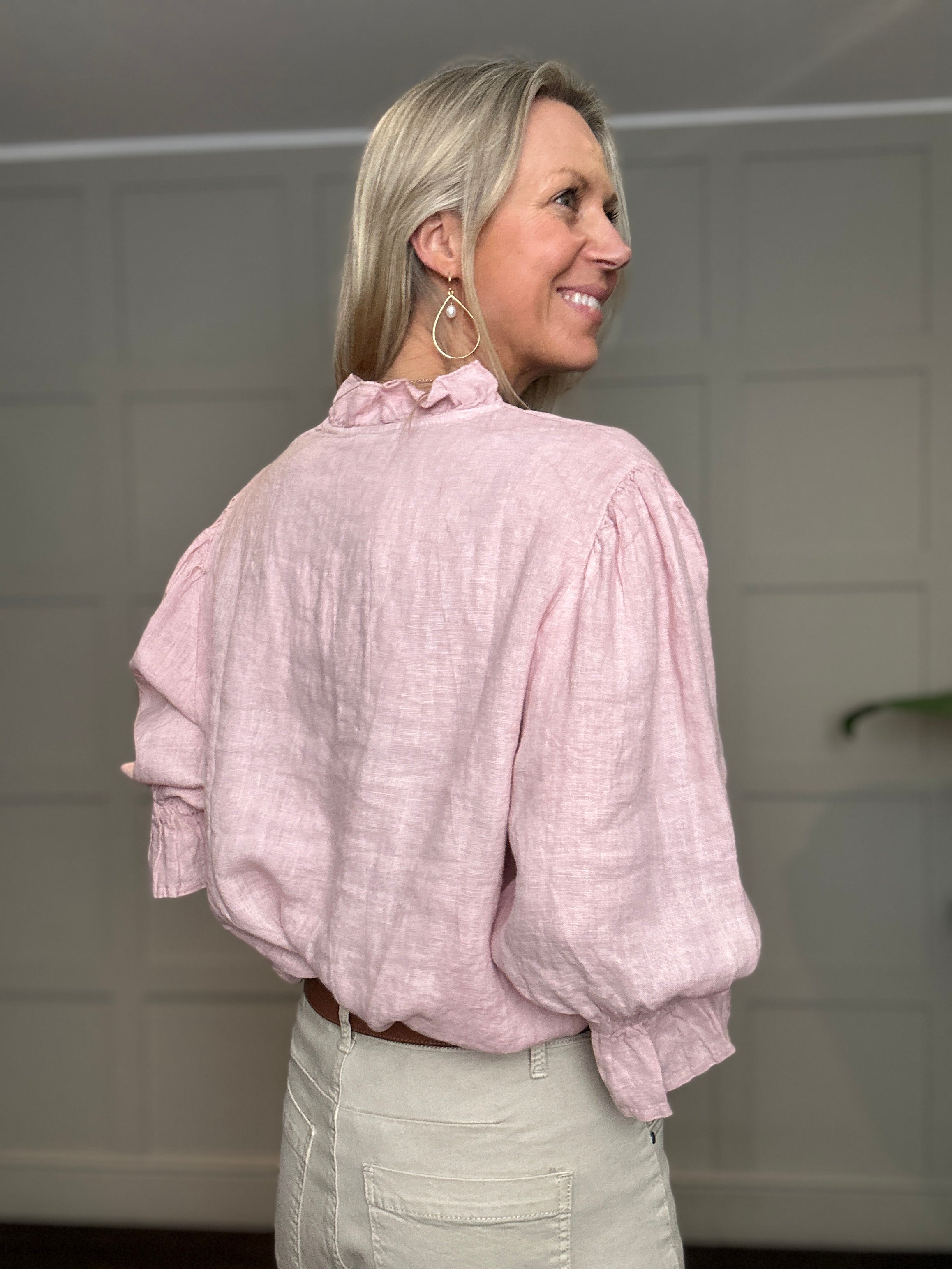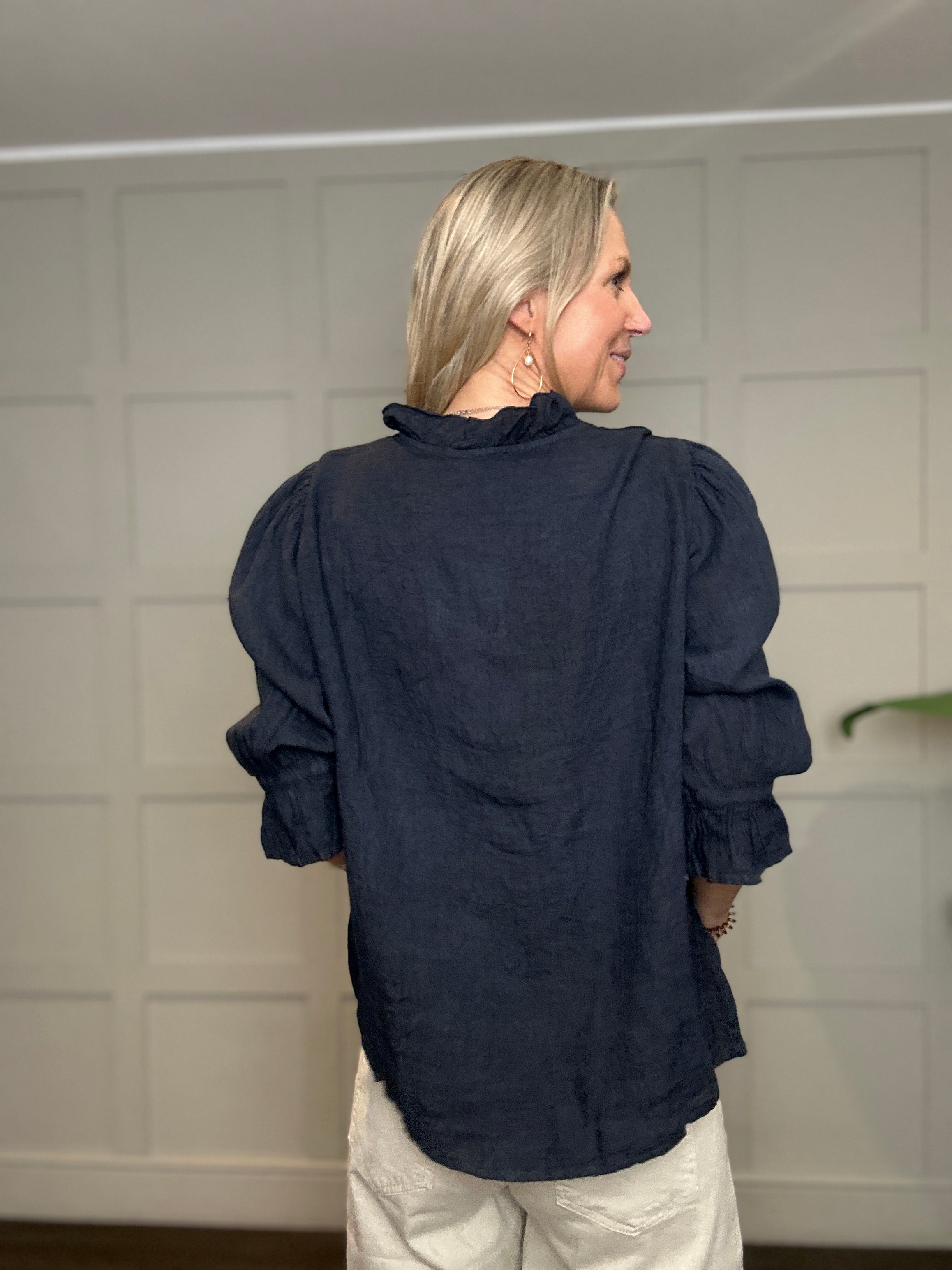 This relaxed fit, classic linen blouse is a wardrobe must have for the spring and summer. Featuring cropped sleeves with elasticated, fluted cuffs, V neckline and ruffle detail on the collar. This blouse works beautifully with jeans, shorts or smarter trousers.