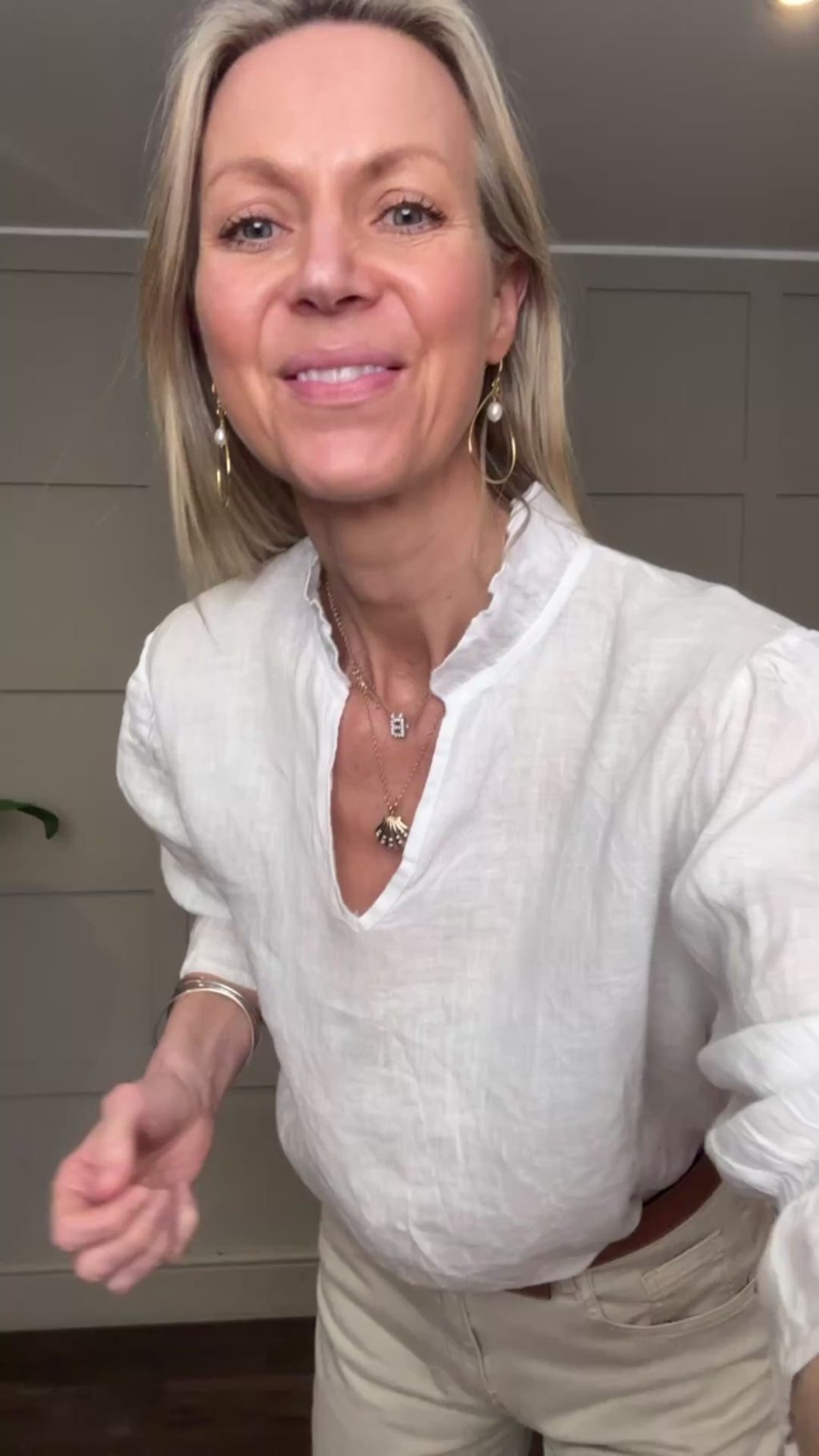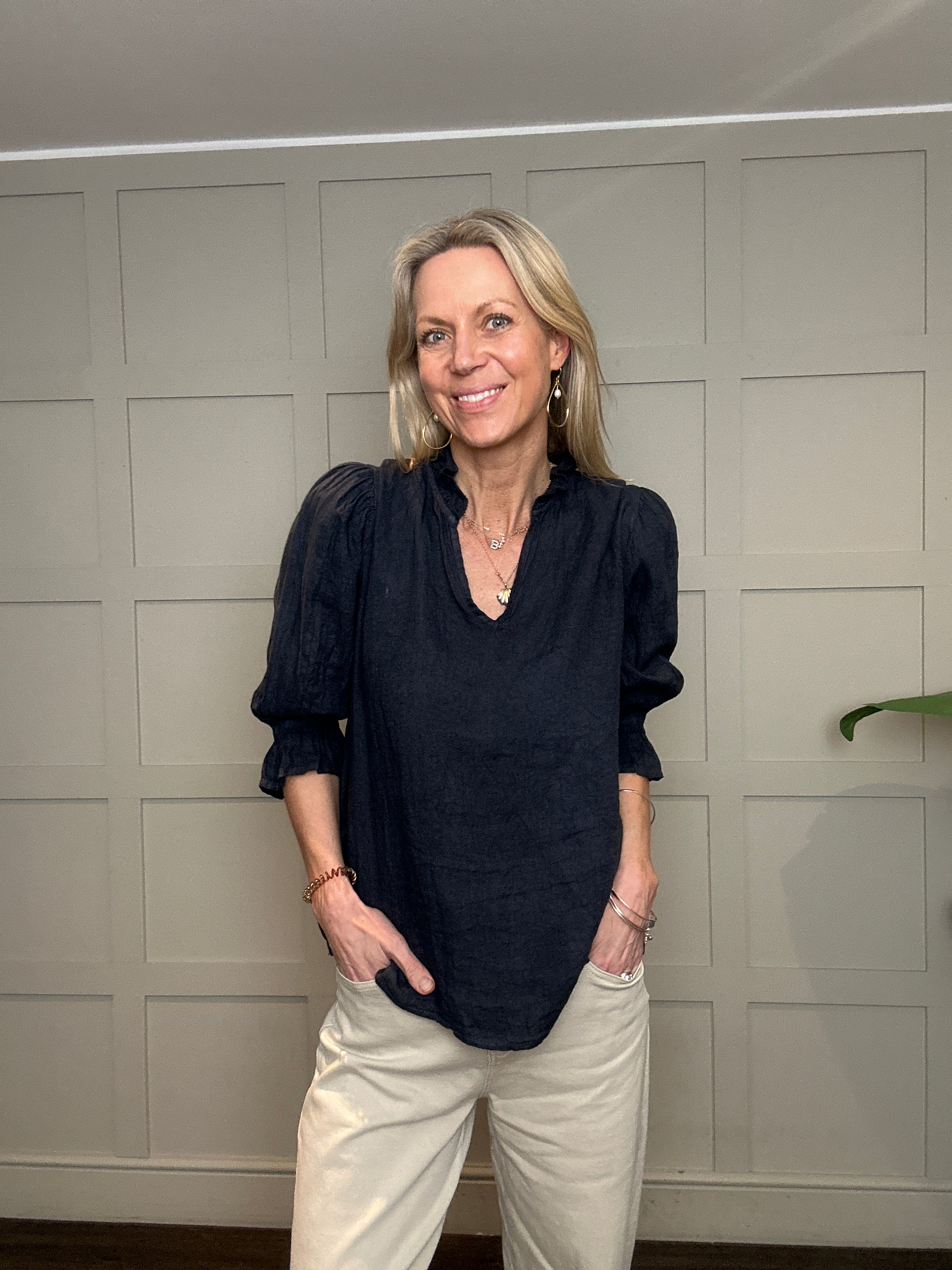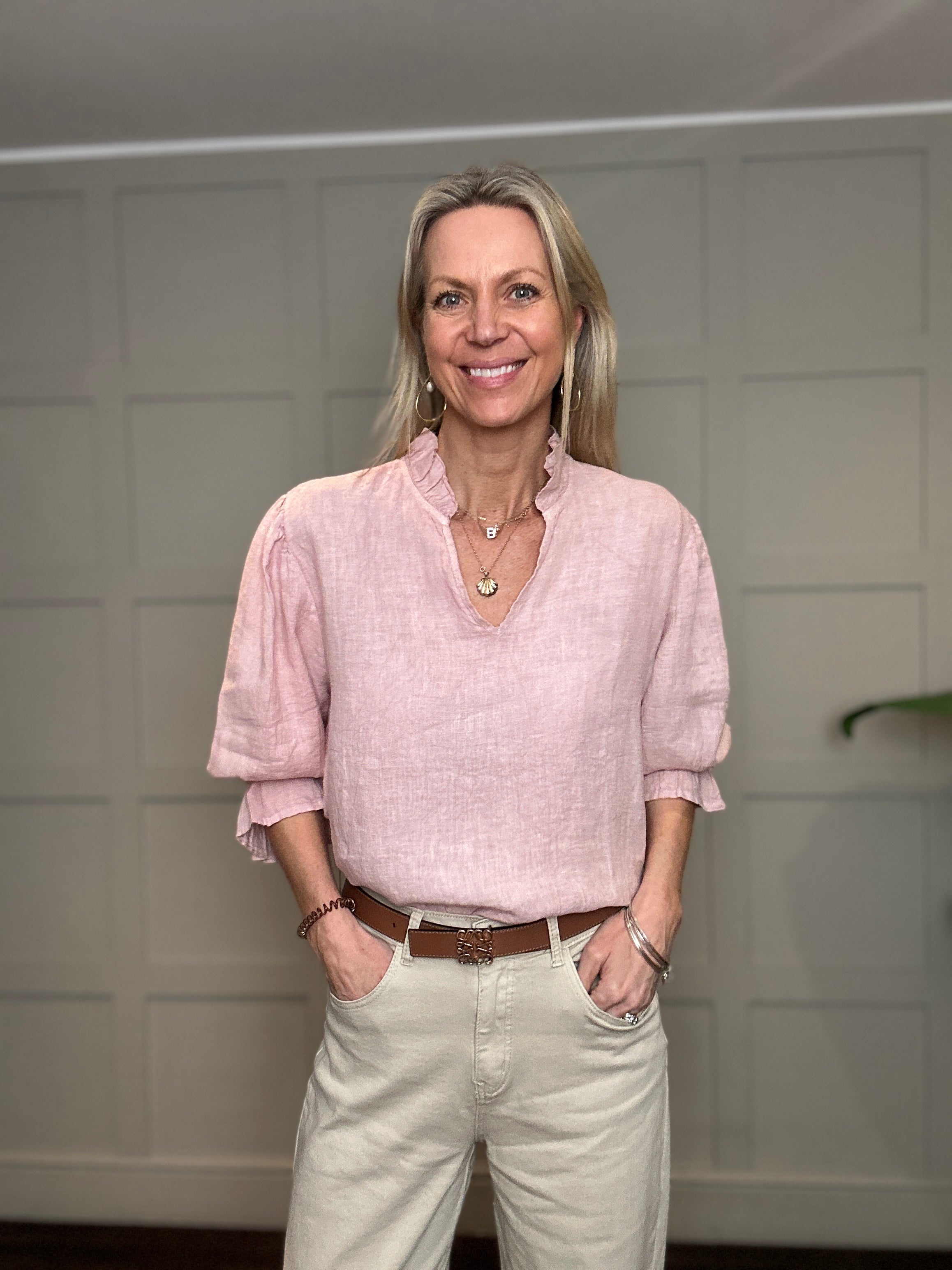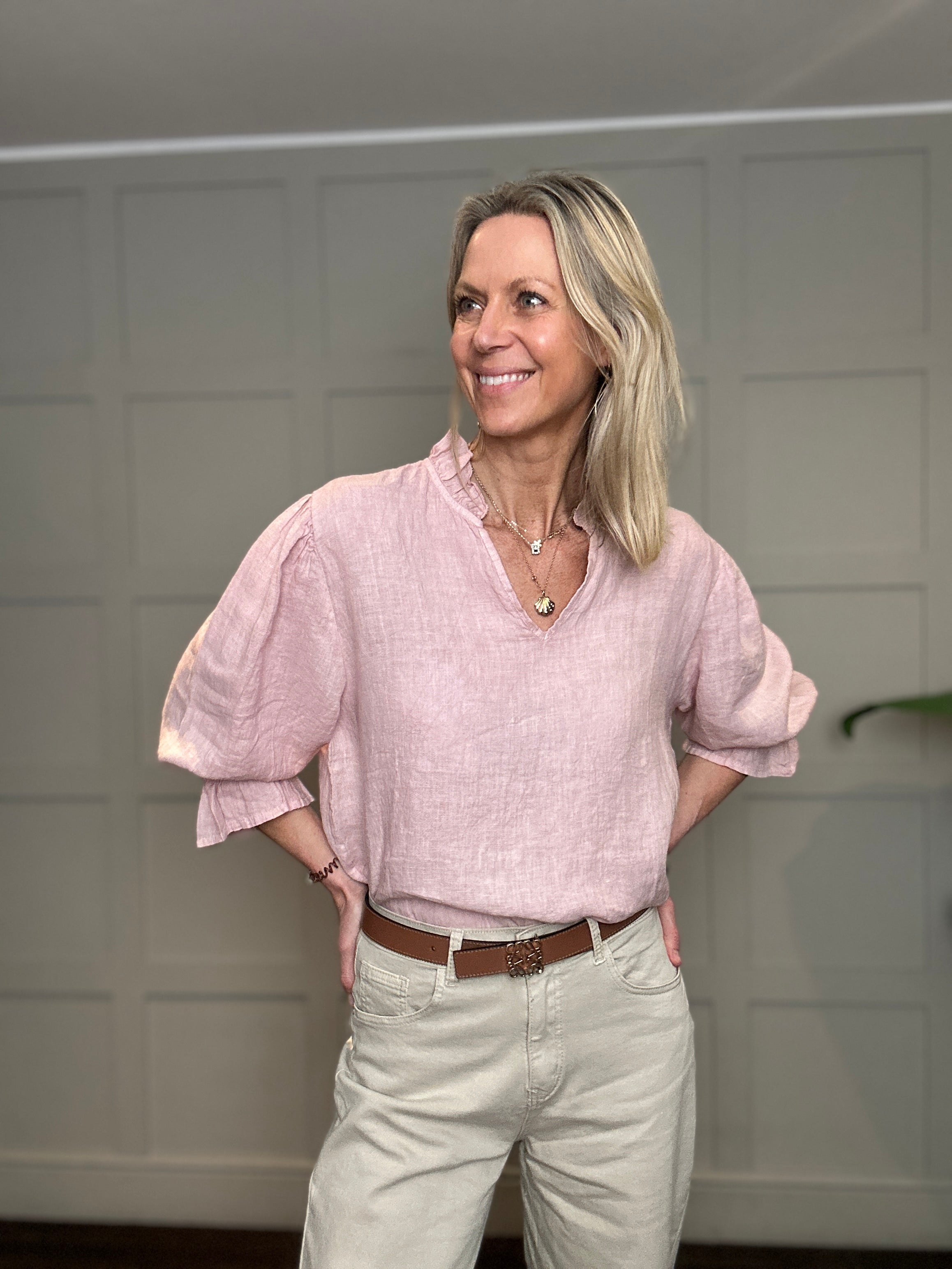 This relaxed fit, classic linen blouse is a wardrobe must have for the spring and summer. Featuring cropped sleeves with elasticated, fluted cuffs, V neckline and ruffle detail on the collar. This blouse works beautifully with jeans, shorts or smarter trousers.